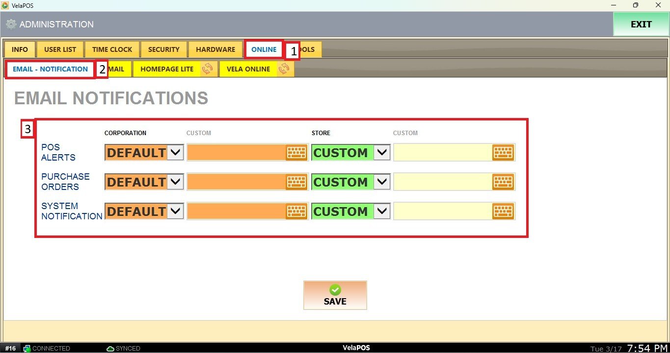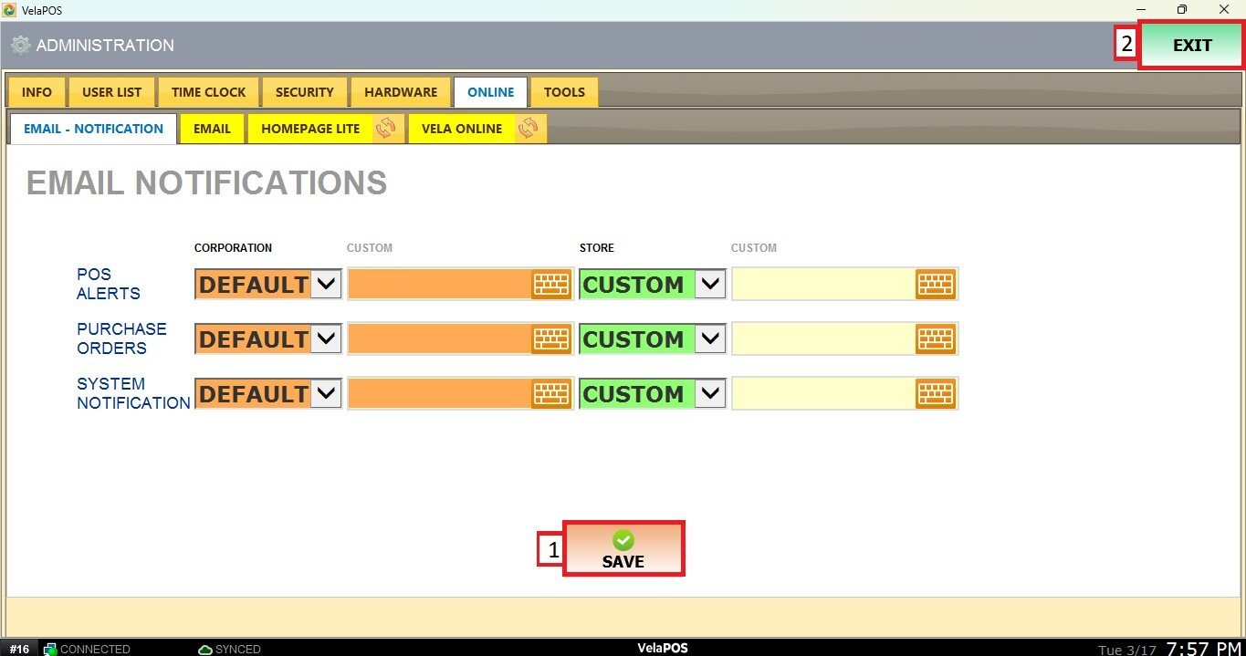 Main Screen> MENU> ADMINISTRATION> ONLINE> EMAIL NOTIFICATIONS