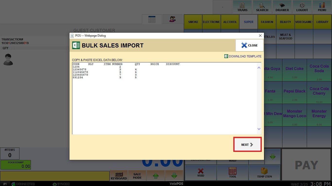 Once the file is complete, copy and paste the data into the Bulk Sales Import screen, and click NEXT.
