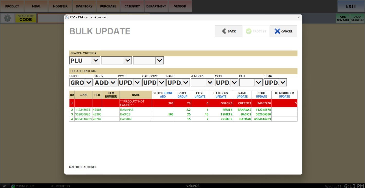 Note: To perform a bulk update, you have to Export the Product List from the system, or have the Products' Code, PLU, or Product Number available.