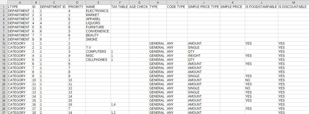 You can view the exported data in the CSV file. The DEPARTMENTS appear in the first eight rows, followed by the CATEGORIES listed in order under the DEPARTMENT ID to which they belong.