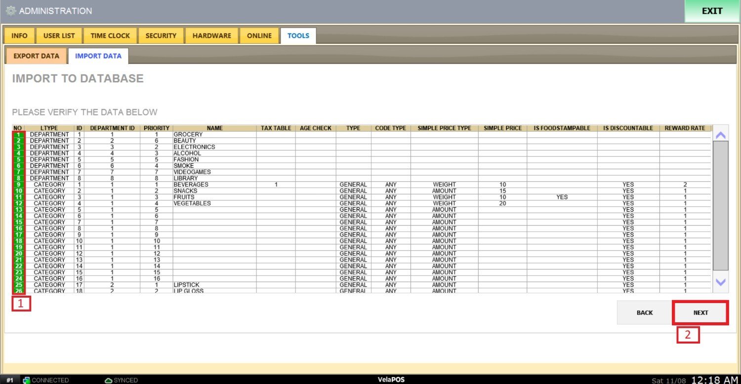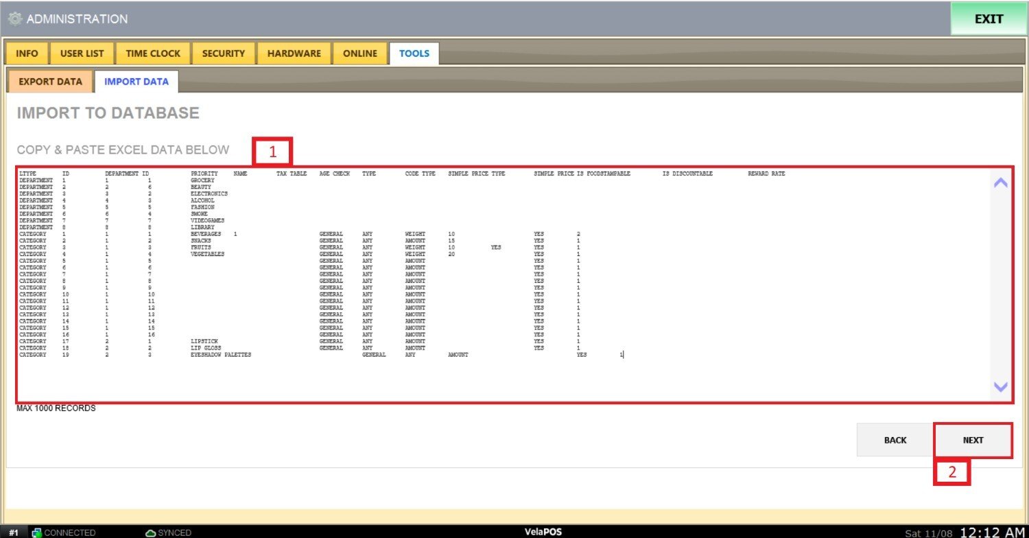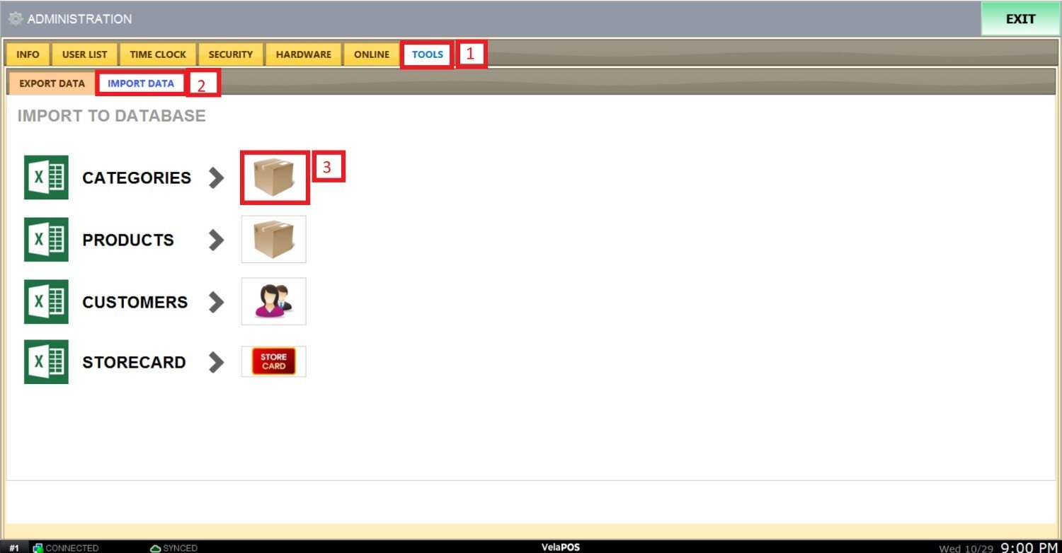 On ADMINISTRATION go to the TOOLS tab, press on IMPORT DATA and click on the CATEGORIE’S BOX.