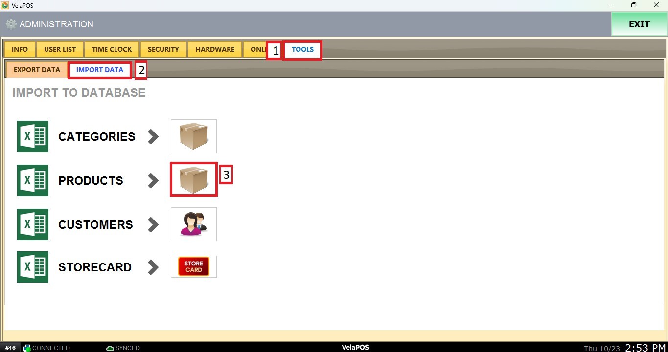 Go to the TOOLS tab, then click IMPORT DATA, and press the BOX icon under the PRODUCTS section.