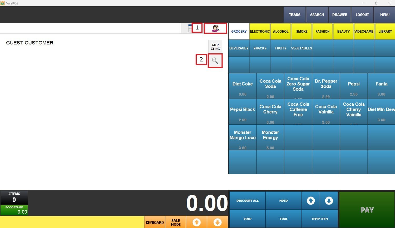 Once on the sales screen, press the two person icon and on the customer panel select the magnifying glass to open the customer search screen.