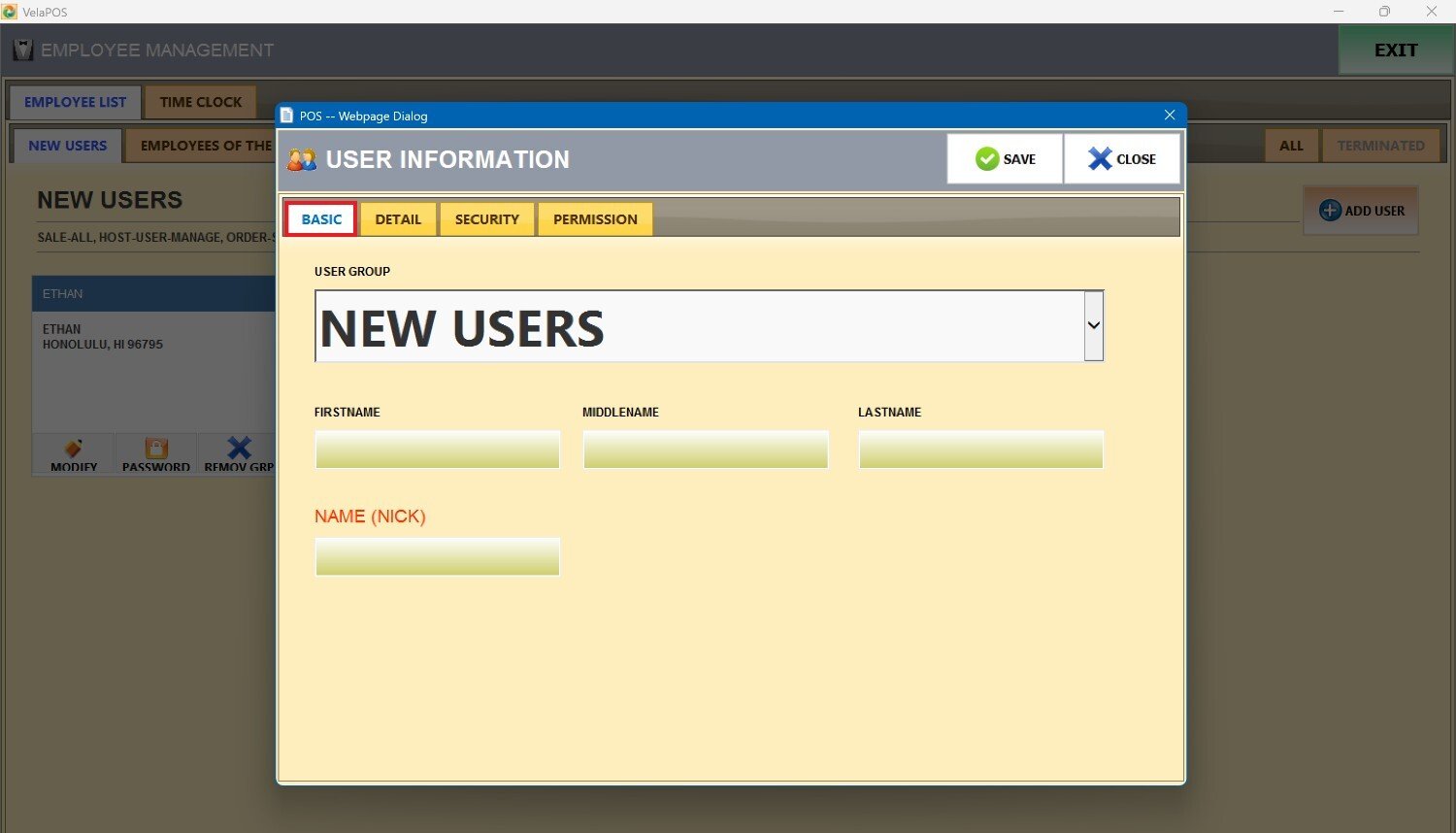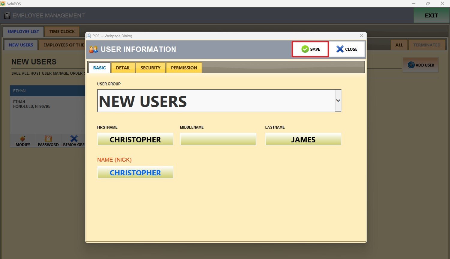 Hint: Additional information can be entered on the DETAIL Tab, but only the employee's first name is required to create the user.