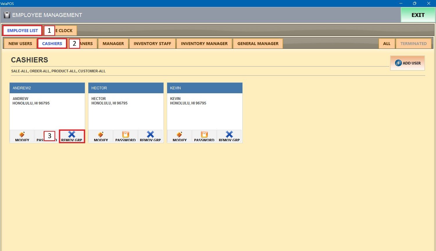 Locate the employee account and press REMOVE GRP.