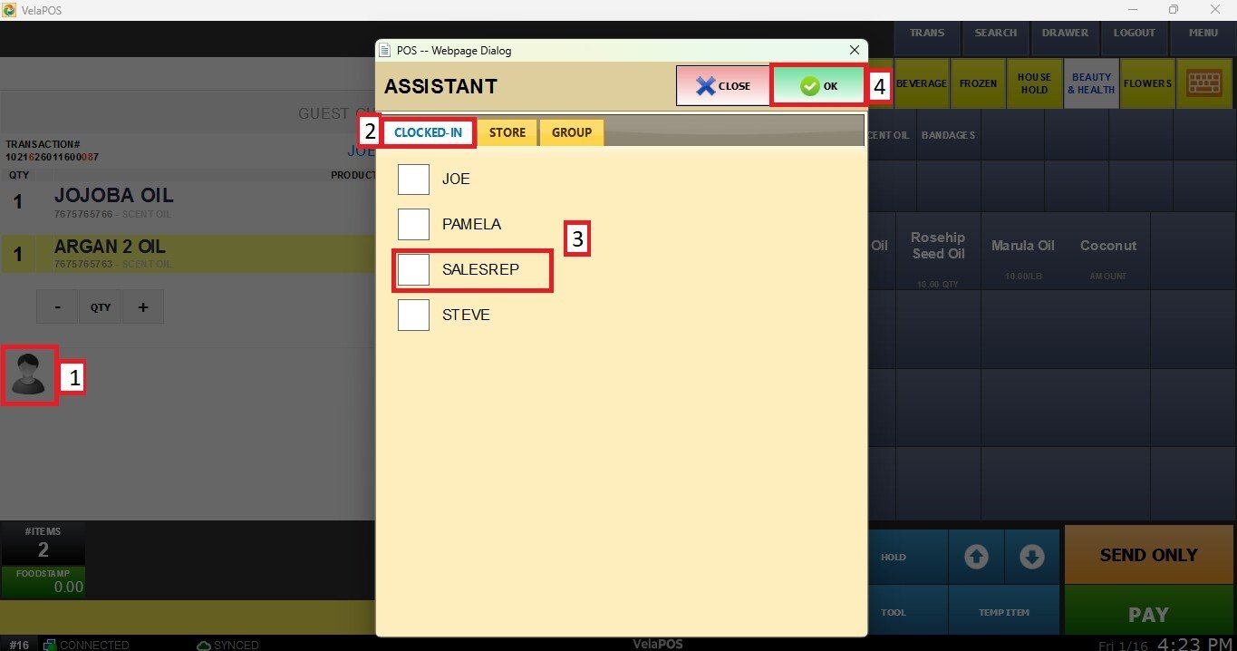 When the person icon is selected, a window appears, allowing the employee who will receive credit for assisting with the sale to be chosen.