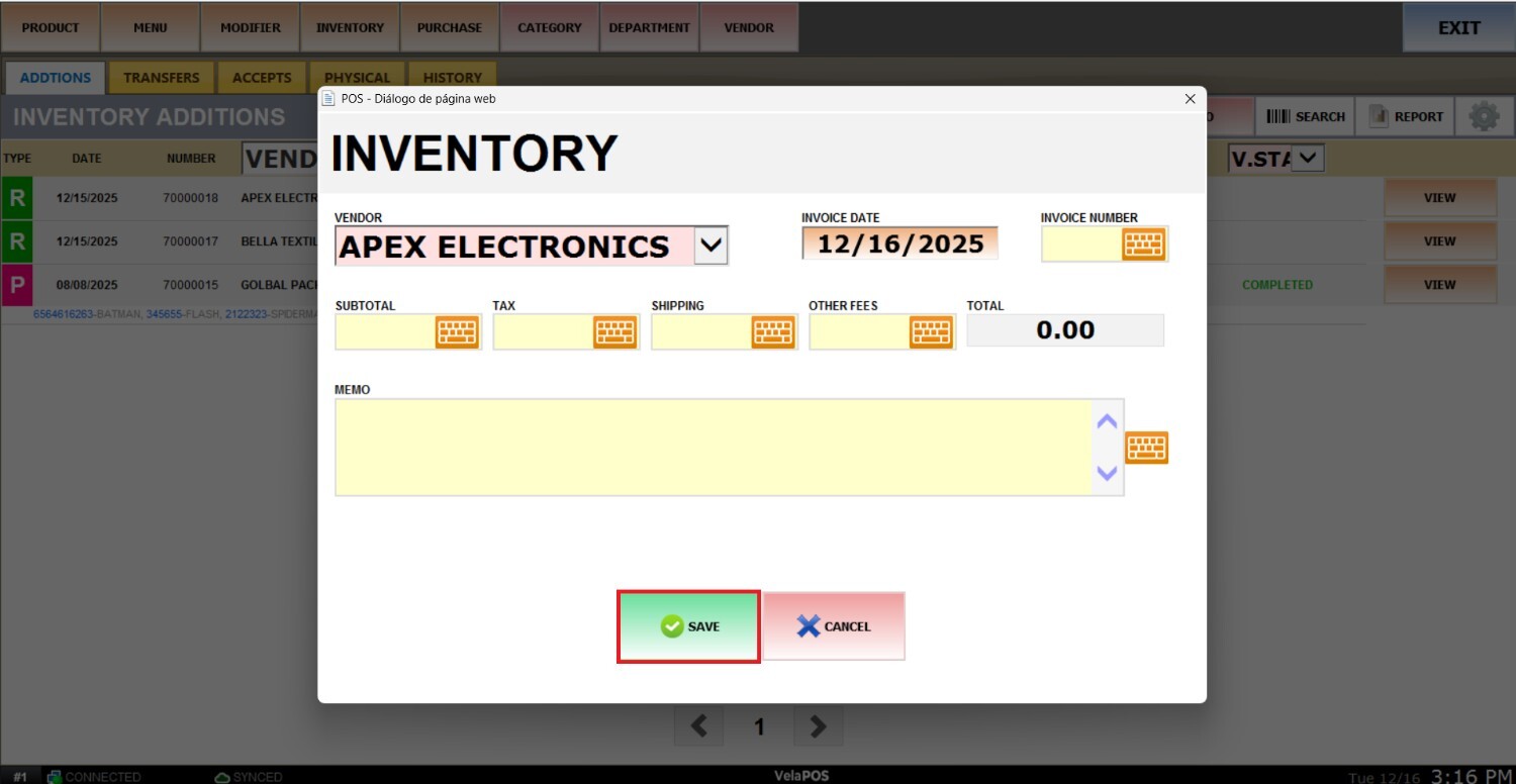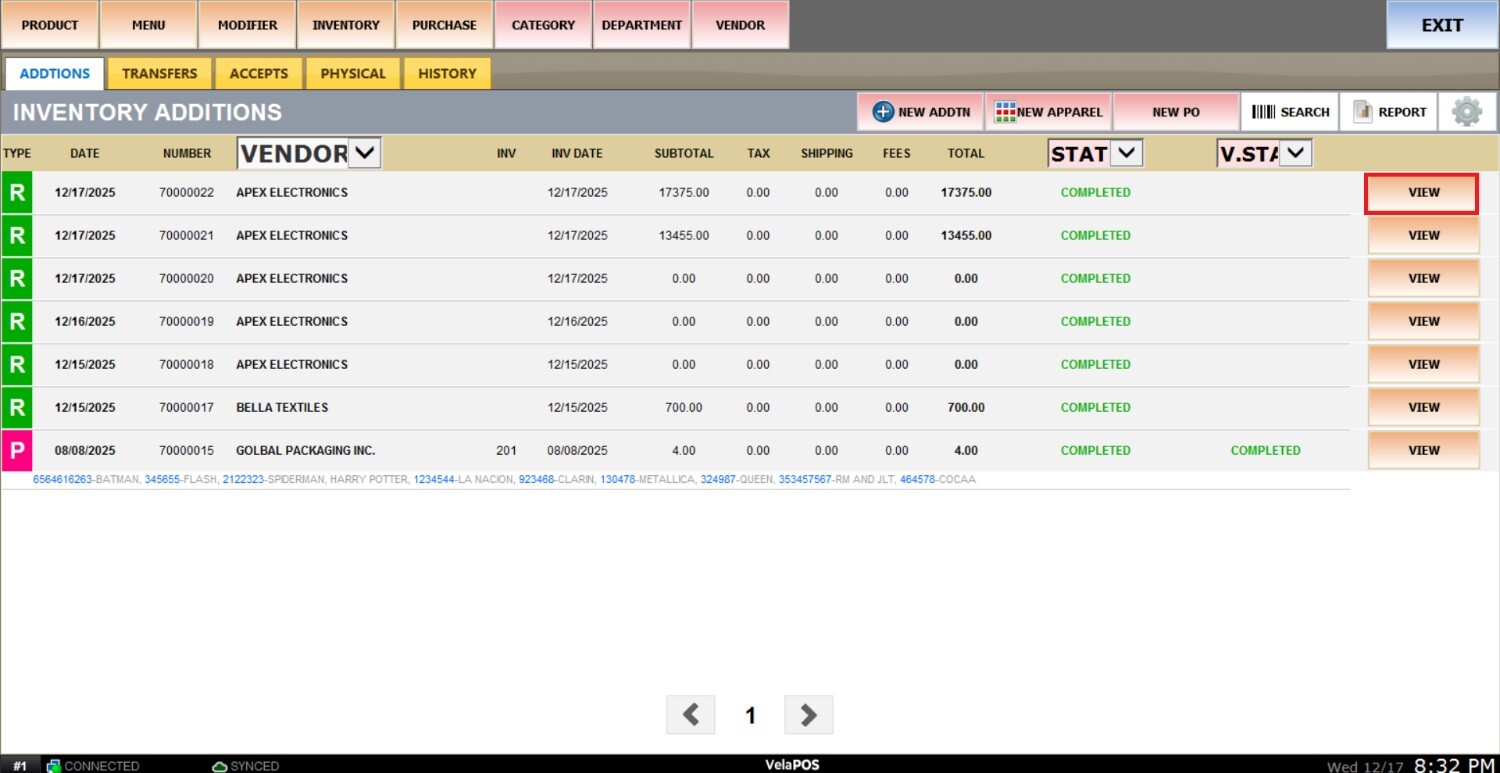 Main screen> MENU> PRODUCT> INVENTORY> ADDITIONS> New additions