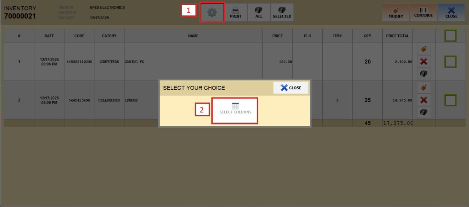 Hint: You can edit the columns shown on the invoice by going to the gear icon and pressing SELECT COLUMNS.