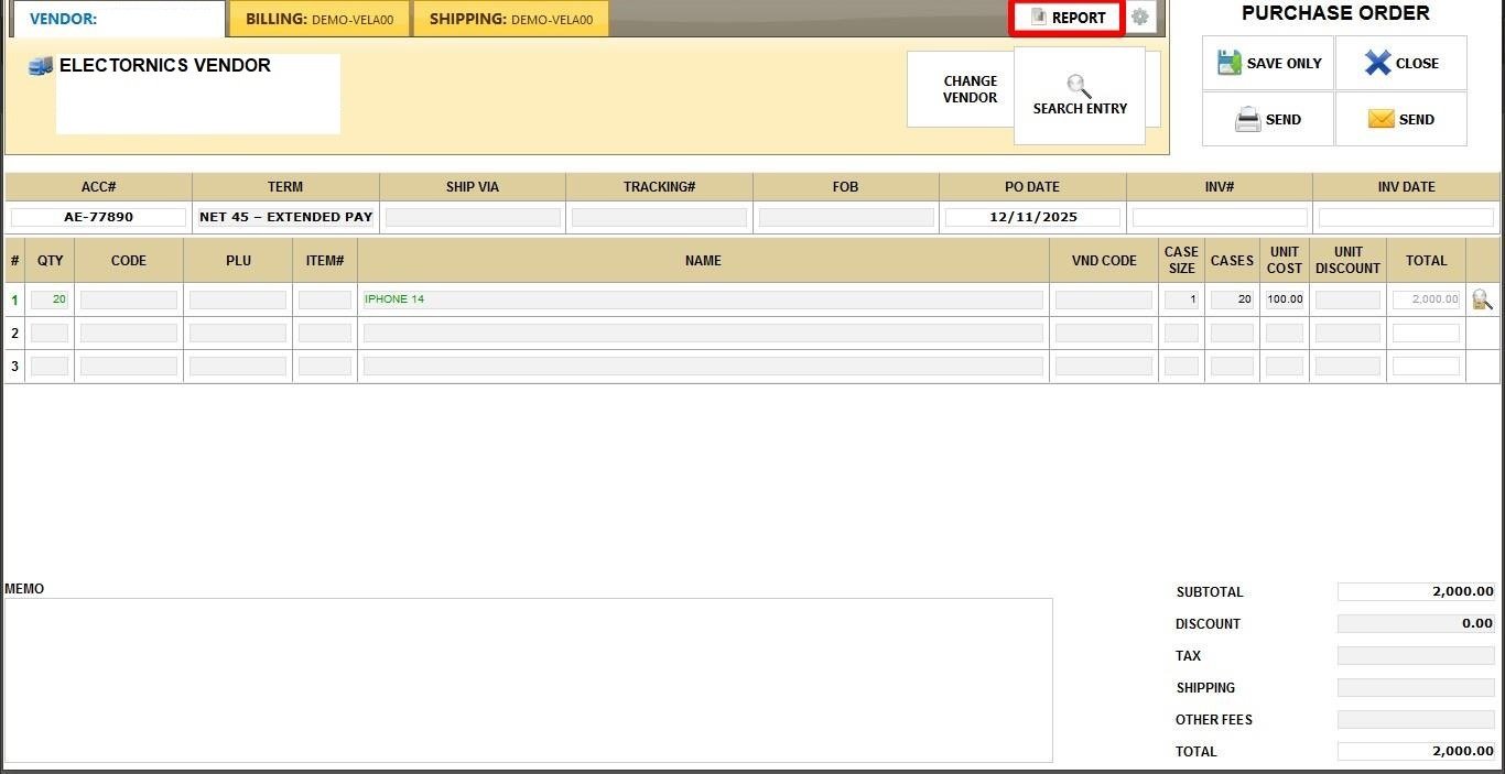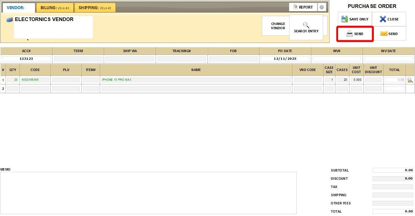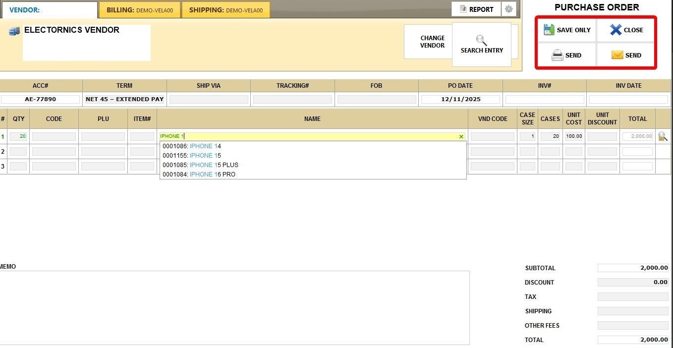 Next, you have three options: select SAVE ONLY to continue editing the order later, press SEND to print it or email it directly to the vendor, or select CLOSE to cancel the order entirely.