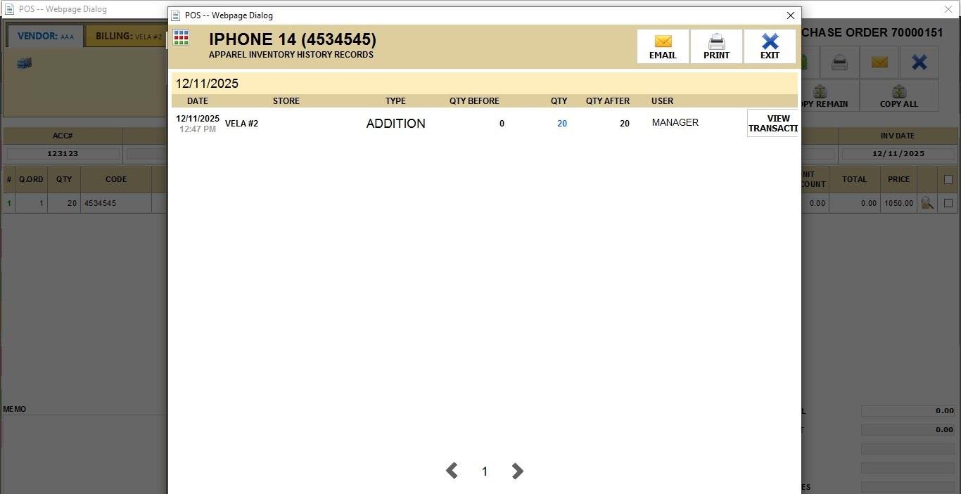 You can see the final stock reflected on the INVENTORY tab in the product detail screen. Additionally, you can review the successful Purchase Order record in the inventory history by going to STL# HISTORY.