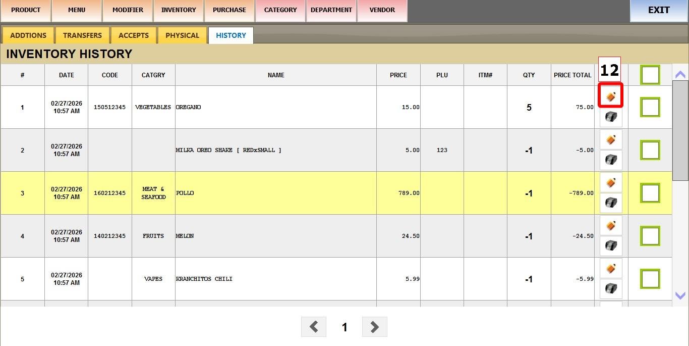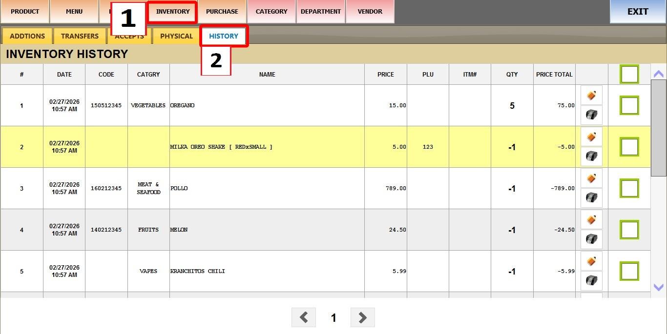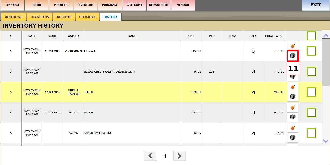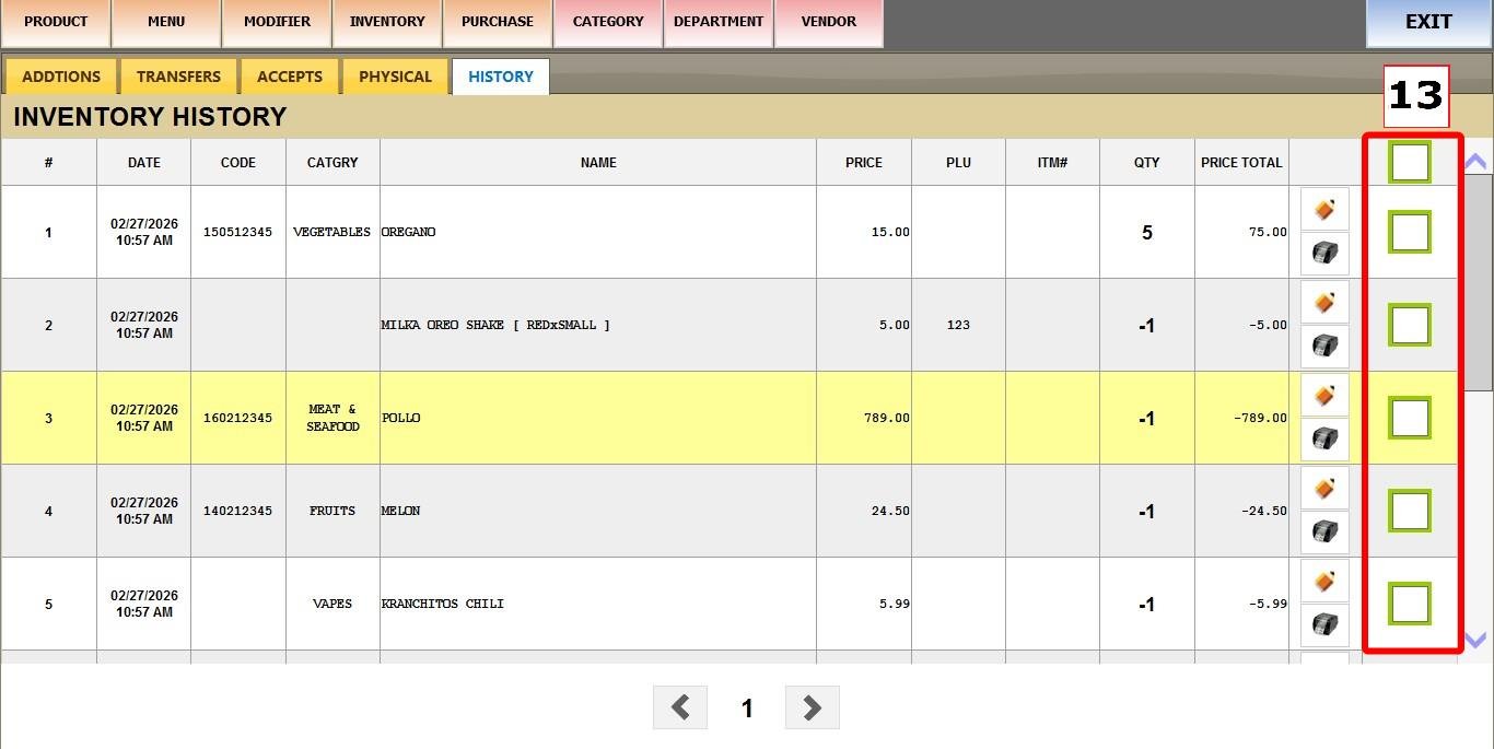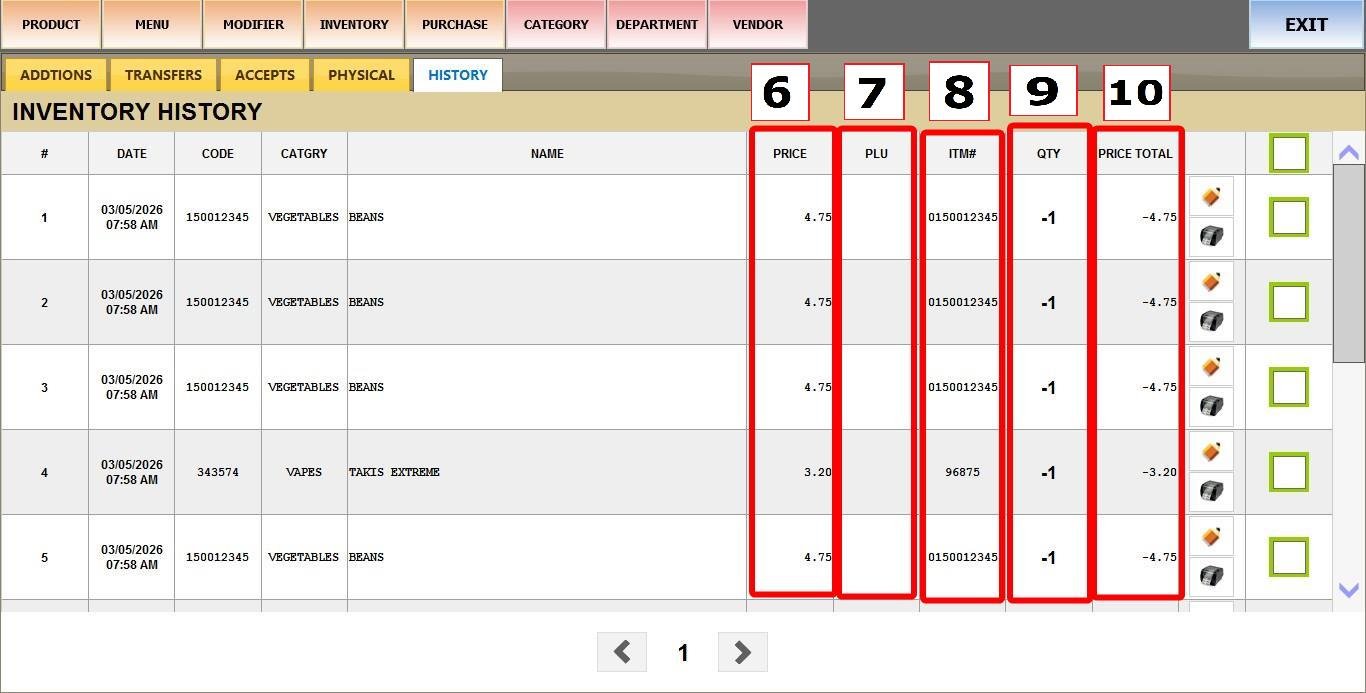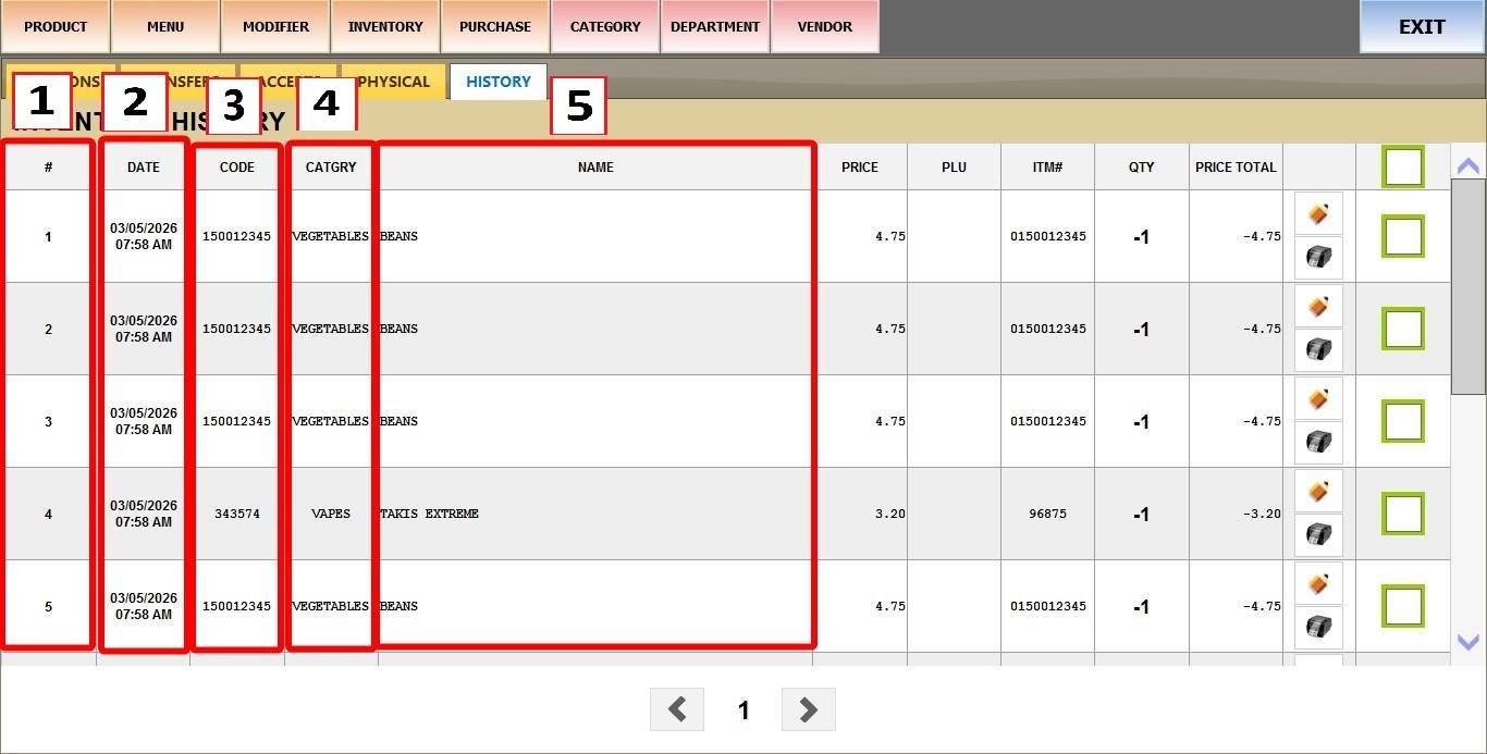 MAIN SCREEN > MENU > PRODUCTS > INVENTORY > HISTORY