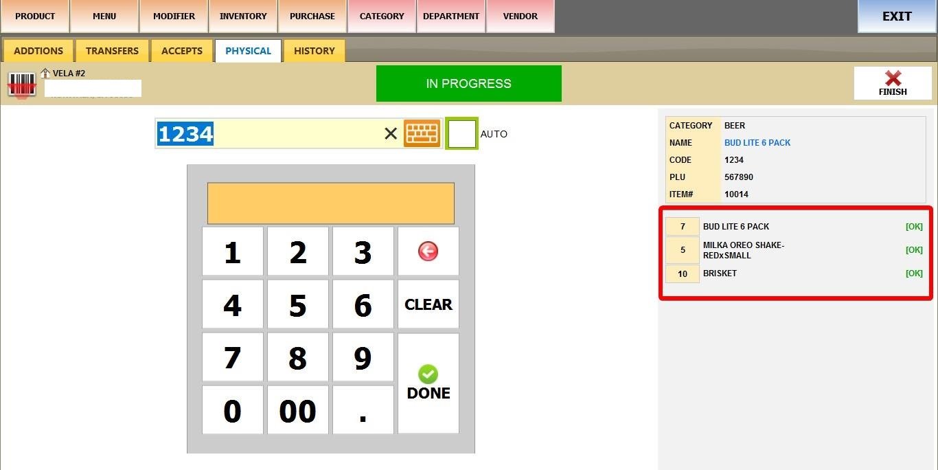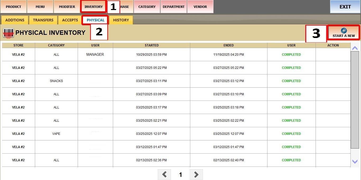 Main Screen > MENU > PRODUCTS > INVENTORY > PHYSICAL > START A NEW.