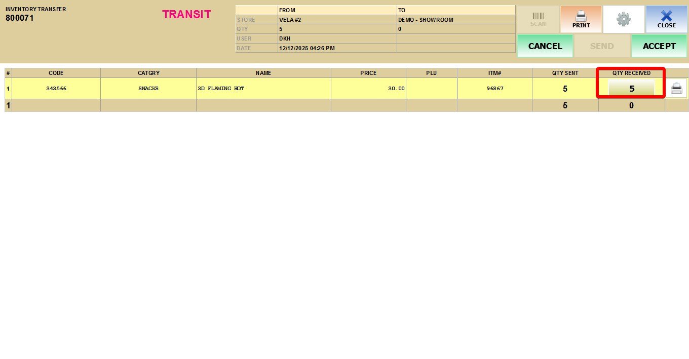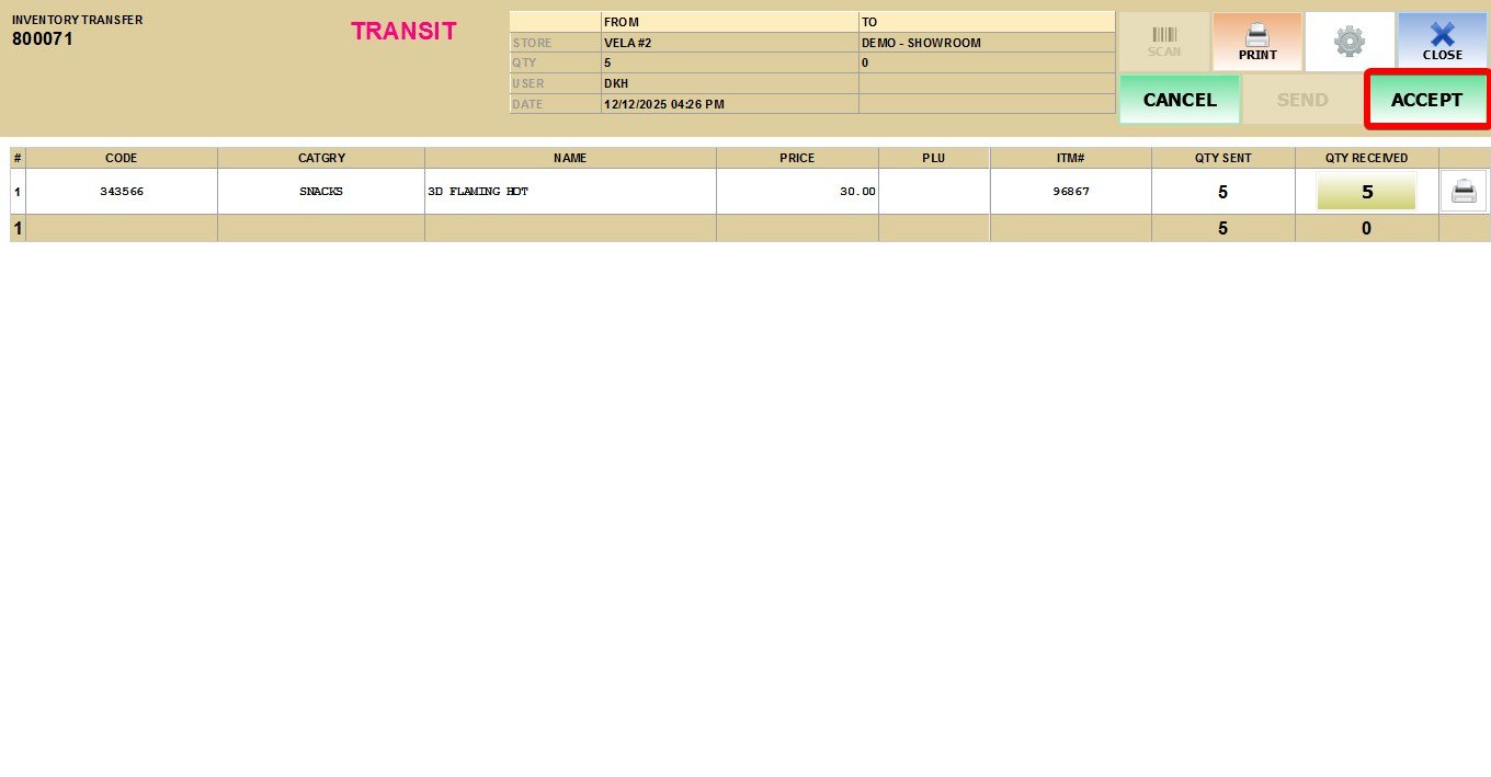 This feature is used by the receiving store to confirm the physical reception of products sent from another location. Once accepted, the inventory is officially moved from In Transit status to the receiving store’s available stock.