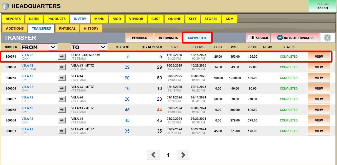 Once accepted, the transfer will be moved to the COMPLETED section, the stock will be added to your inventory, and the transaction will be recorded in the product’s history.