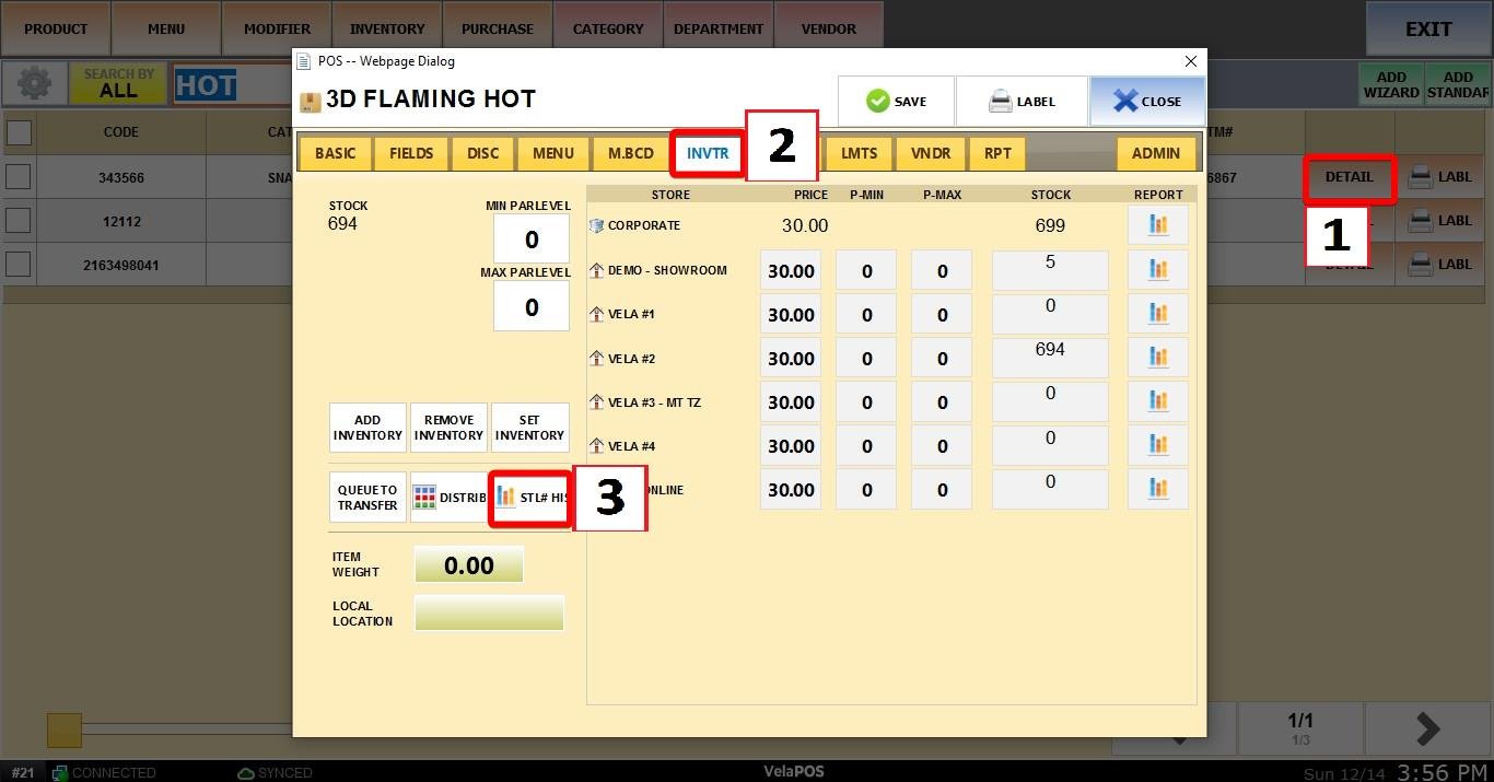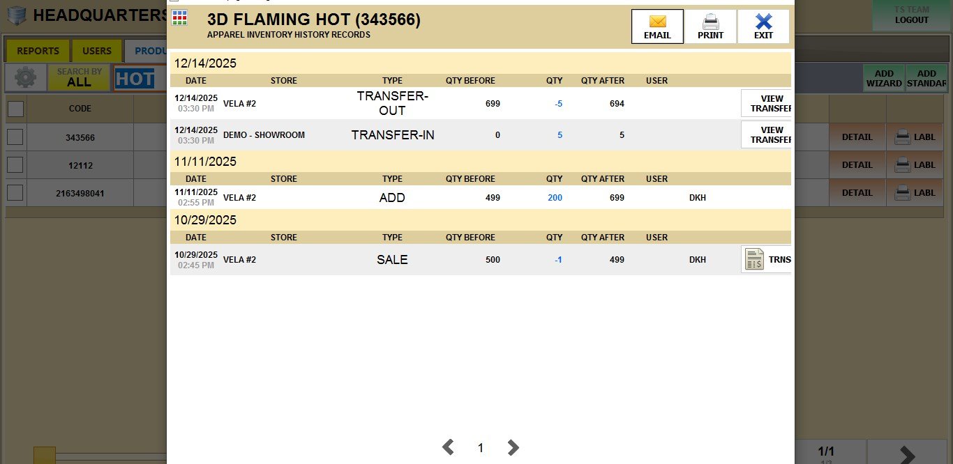 Go to MENU > PRODUCTS. Search for the specific product you received, and press DETAIL. Then navigate to INVENTORY > STL# HISTORY. The accepted transfer will appear in the history log.