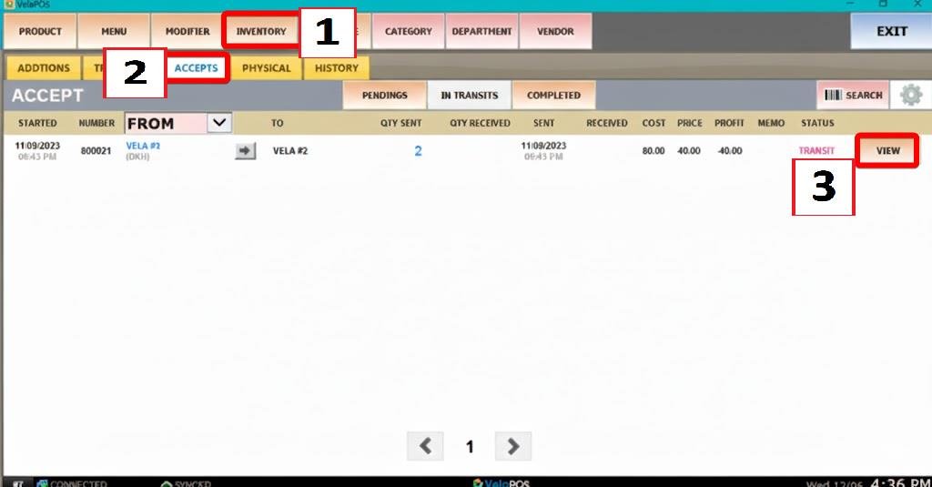 Under the INVENTORY tab, selec ACCEPTS, locate the transfer request marked as TRANSIT and press VIEW.