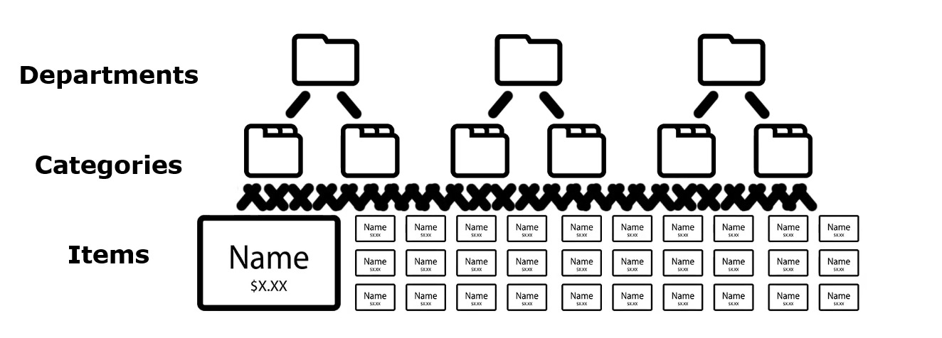 Our inventory is divided in 3 main sections: Departments, Categories and Items.