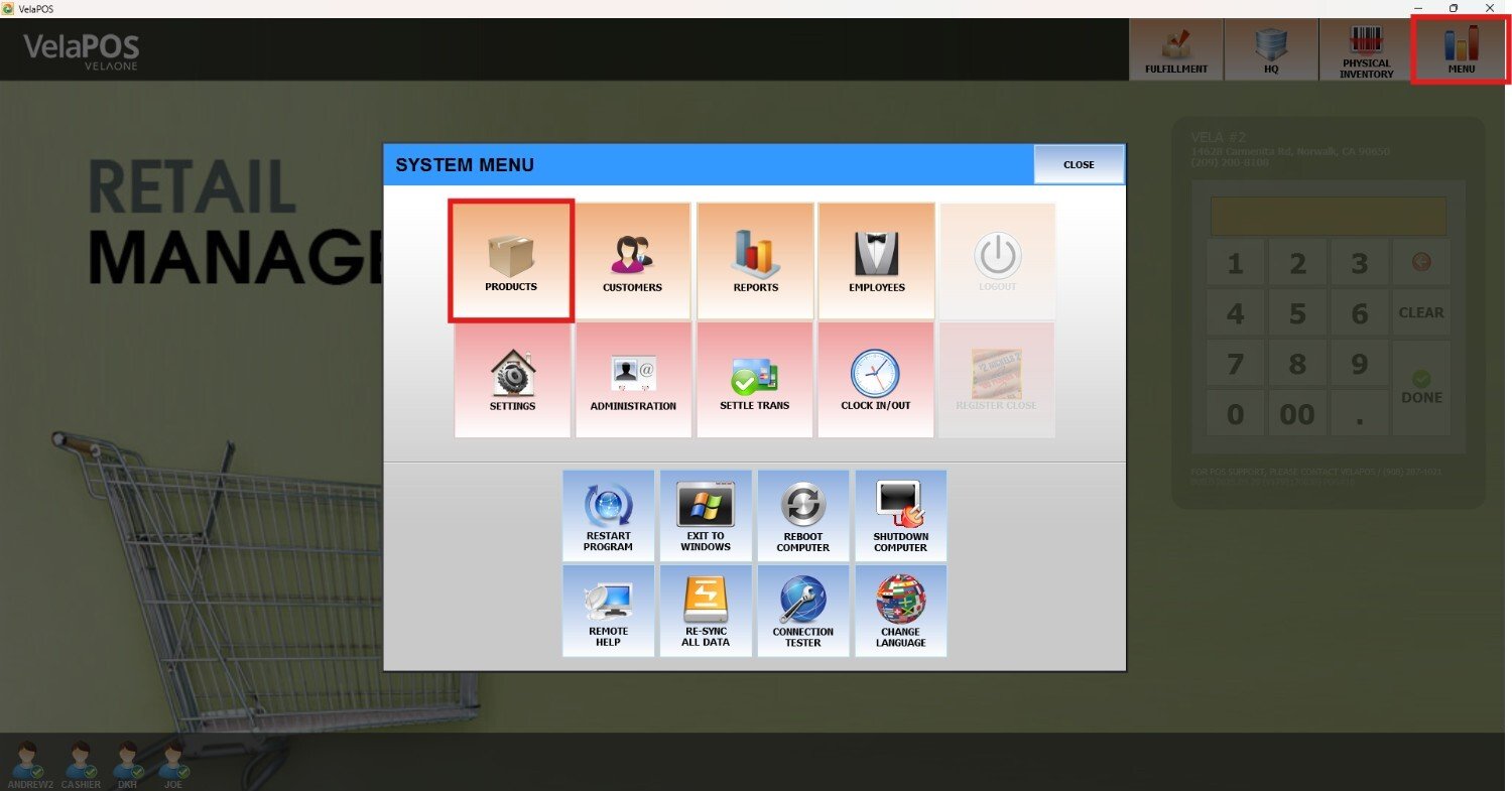 On the Main Screen, go to MENU and press on PRODUCTS.