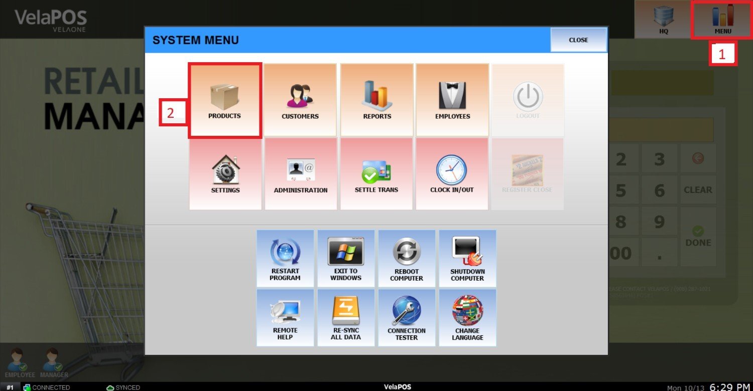 On the Main Screen, go to MENU and press on PRODUCTS.