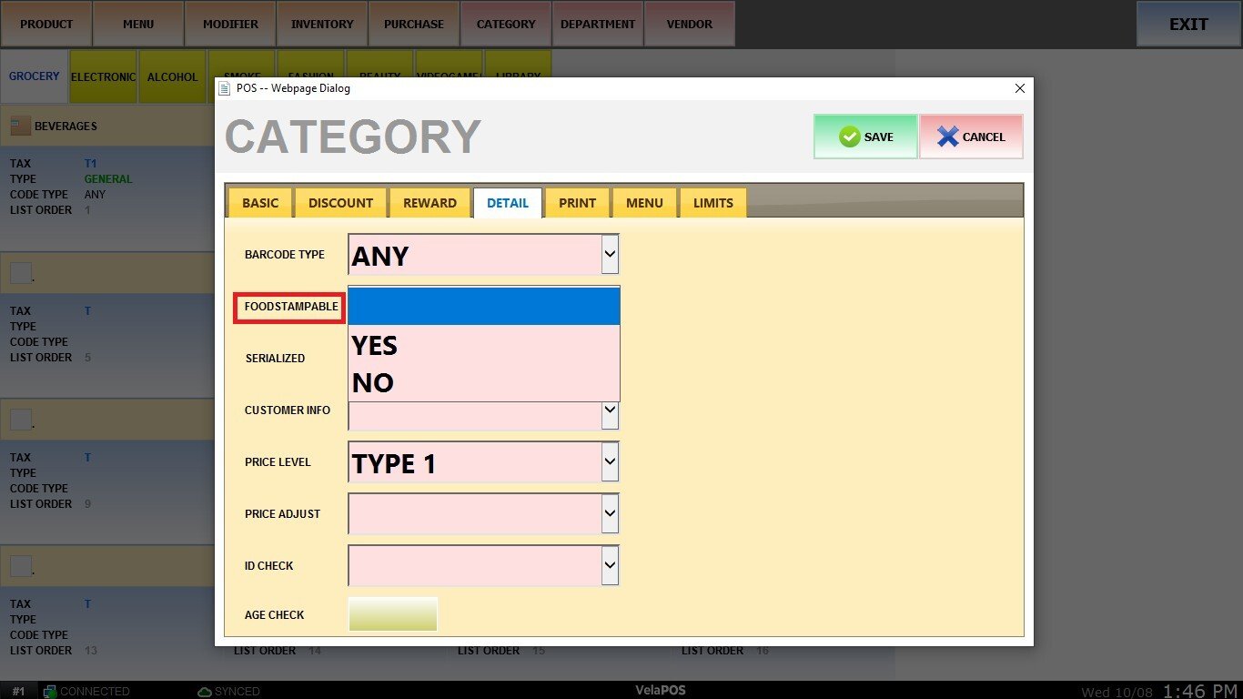 Specify whether items in this category are eligible for payment with EBT (YES or NO).