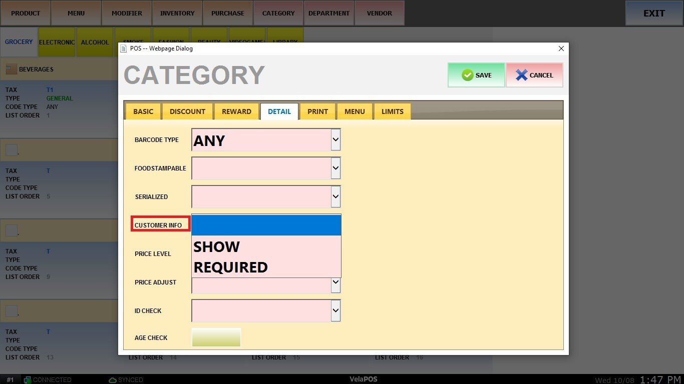 Decide whether customer information should be displayed or required when selling items from this category. Select SHOW to display customer list or REQUIRED to restrict users from closing the customer list, making it mandatory.