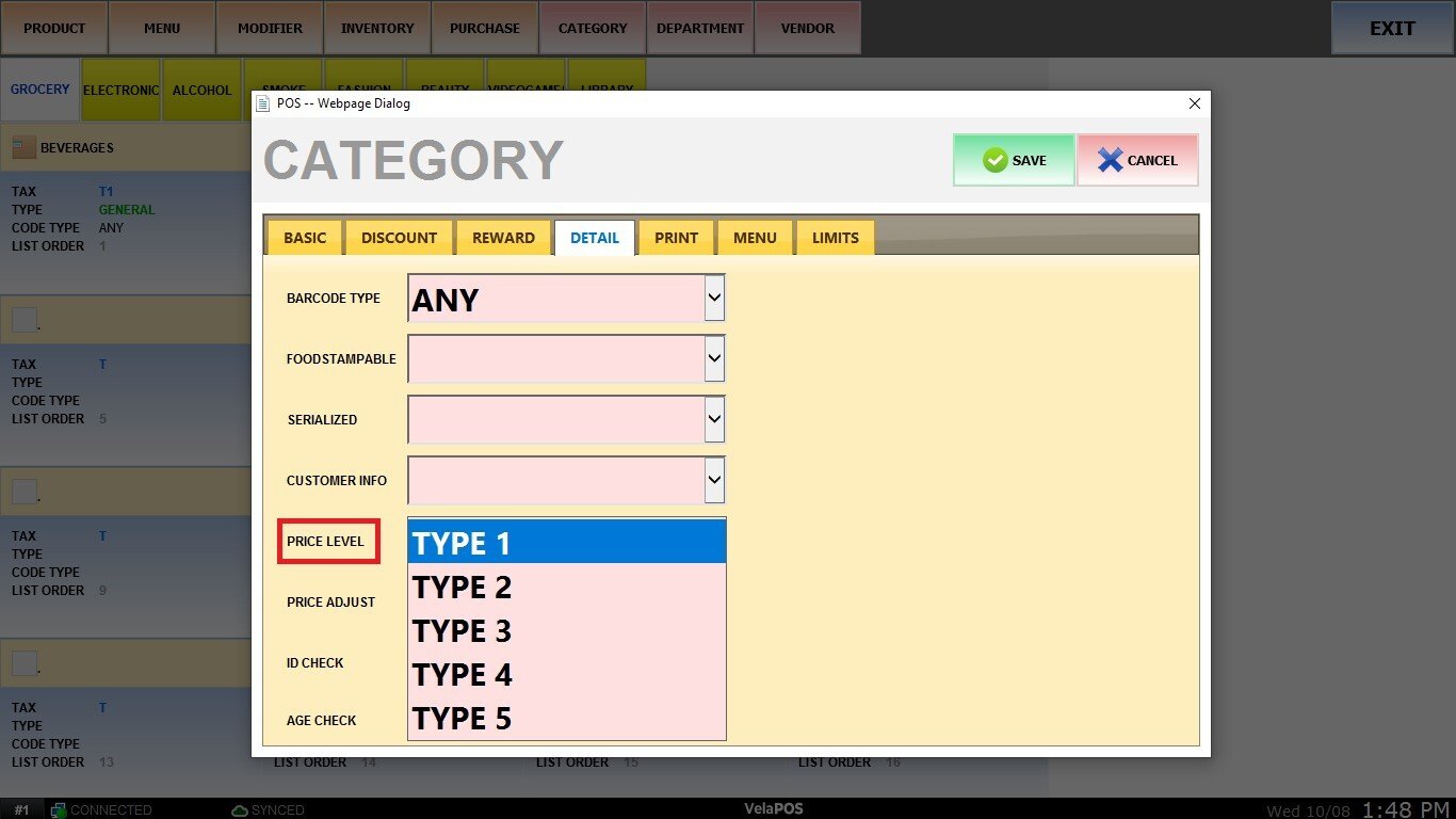 Assign a pricing tier to control which price structure applies to items in this category. Each price level represents a specific margin or profit percentage that can be configured differently for each employee group, allowing for flexible pricing and profit management.