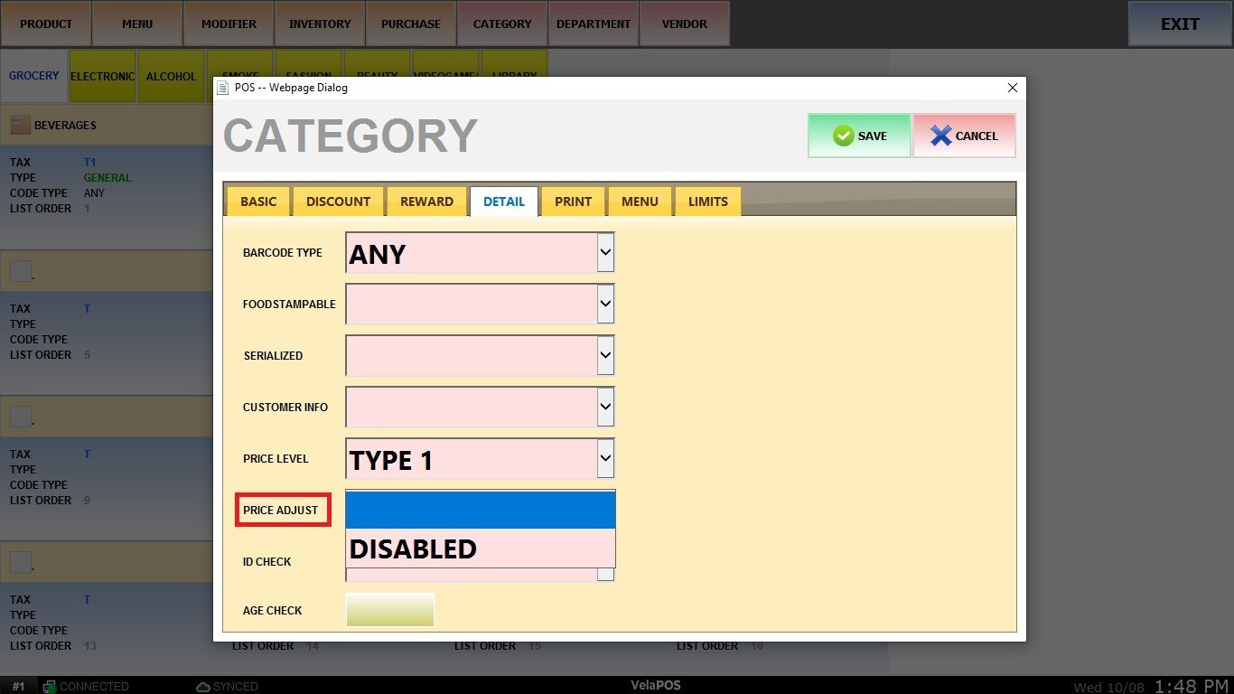 Configure whether the items within this category will display both cash and credit card price on the sales screen by leaving the field in blank or if it will display only the list price by selecting DISABLED.