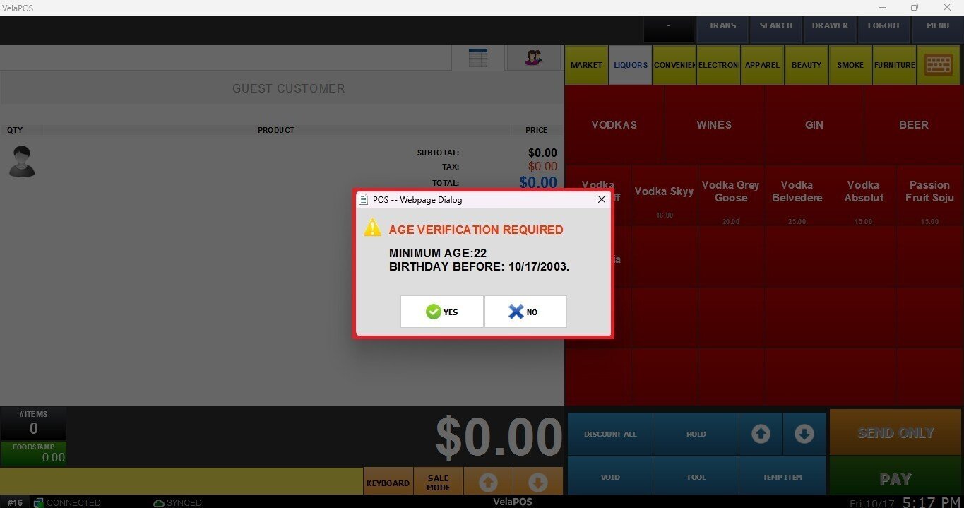 A pop-up window will require entering or scanning the customer’s date of birth to automatically validate the age.