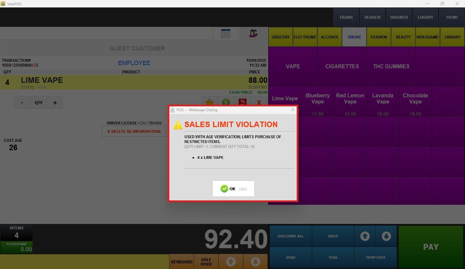 On the sales screen, choose the category with the applied limit and ring up an item from it. If the quantity exceeds the set limit, the system will display a warning when pressing on PAY and will prevent the transaction from being completed.