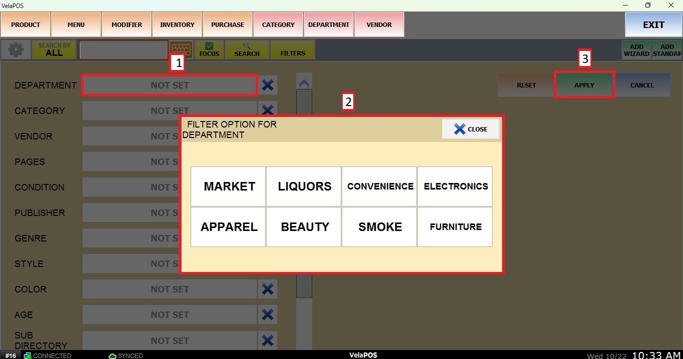 When clicking on a filter, a window will appear prompting you to select an option for the chosen filter (e.g., a department of your inventory for DEPARTMENT), then press APPLY.