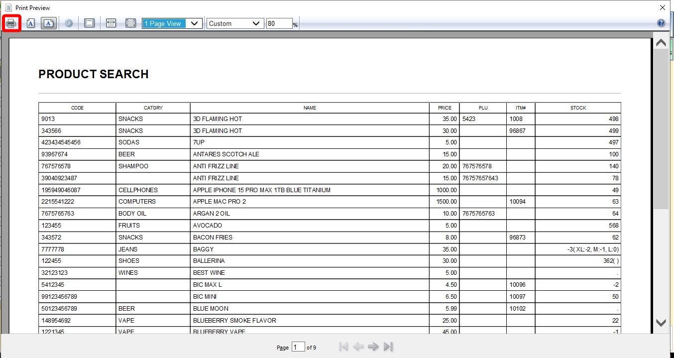 The system will process your product list and open a new window with a preview of the document ready to print. If you want to print a different section, make sure to run a search or apply filters before opening the gear icon.