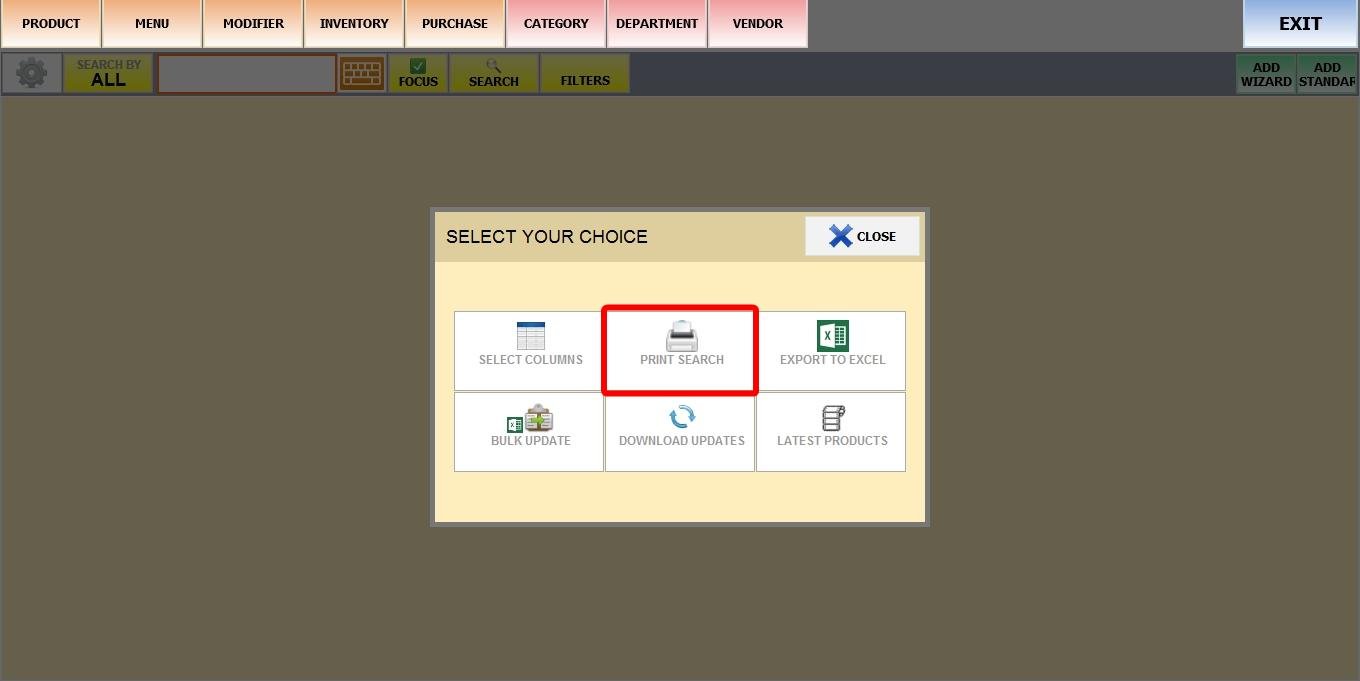 Go to MENU > PRODUCTS> GEAR ICON> PRINT SEARCH.
