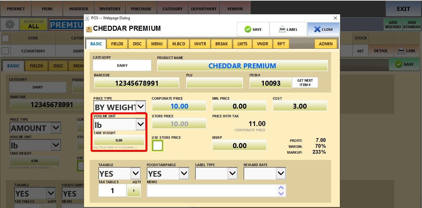 The price is calculated by multiplying the item’s price per unit by its weight. The weight can be captured using an integrated scale or entered manually by the cashier.