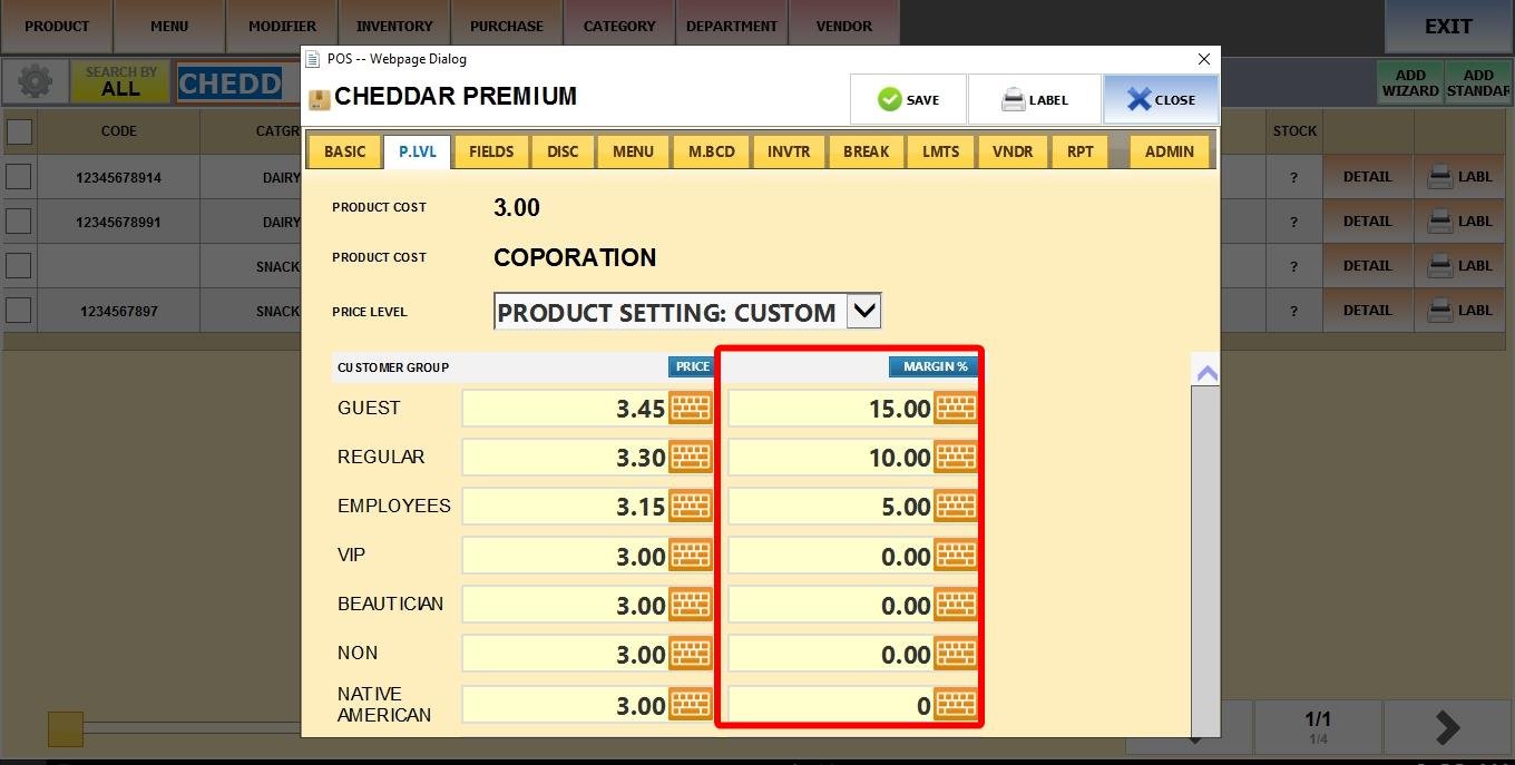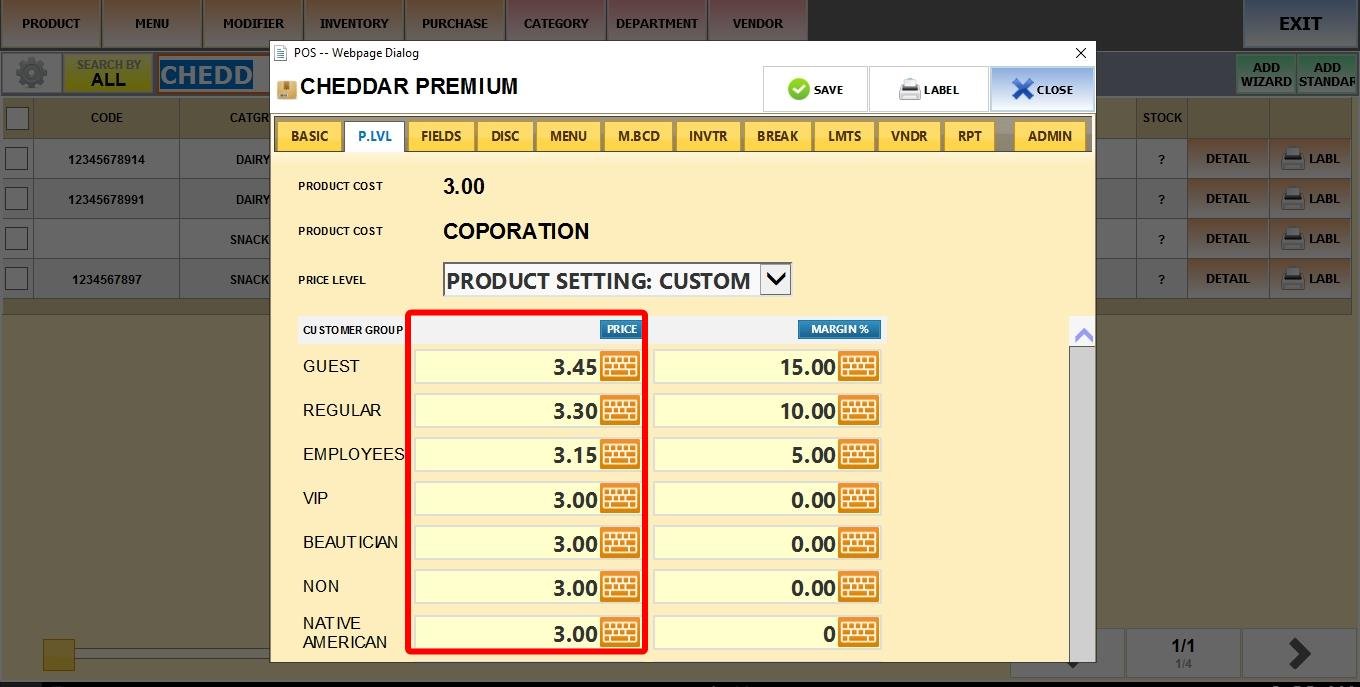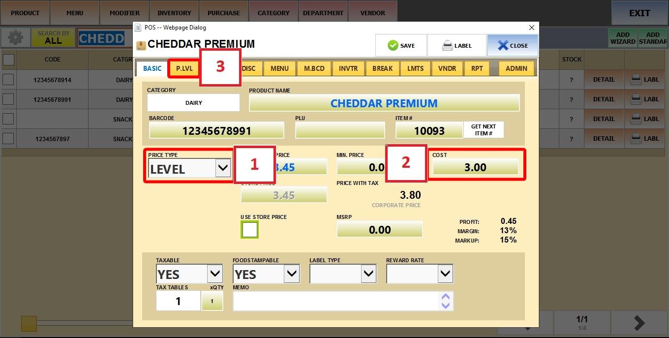 On PRICE TYPE select LEVEL. Set the COST of the product and go to the P. LVL tab.