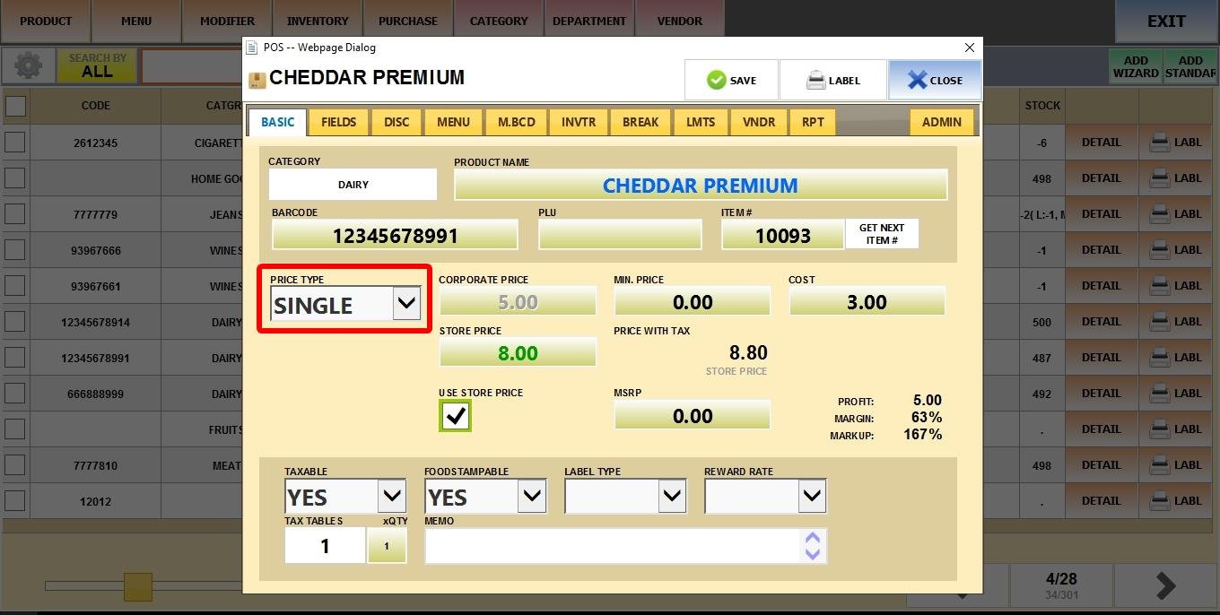 MENU > PRODUCTS> Select an Item> DETAIL> BASIC> PRICE TYPE.