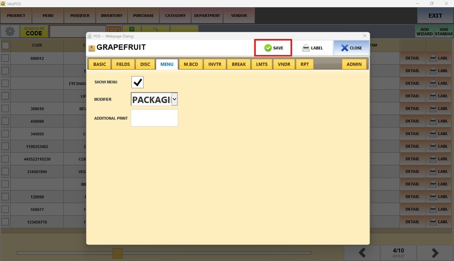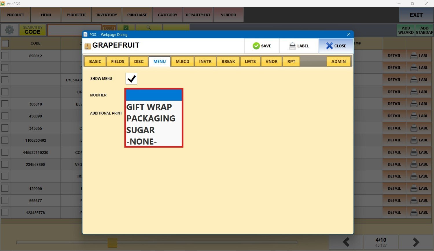 Main Screen> MENU> PRODUCTS> Product's Detail> MENU Tab> Modifiers