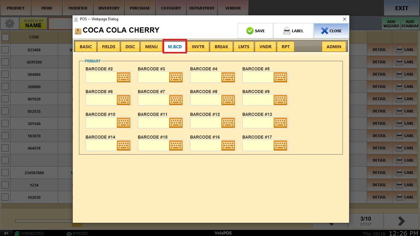 Go to the M.BCD tab, click on a field to enter a barcode. Each field (for example, BARCODE #2, BARCODE #3, etc.) represents an additional space where you can enter a valid barcode.