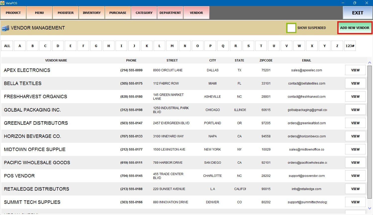 Press VENDOR to find the complete list of vendor accounts. Each entry includes details such as Vendor Name, Phone Number, Address, City, State, Zipcode, and Email.