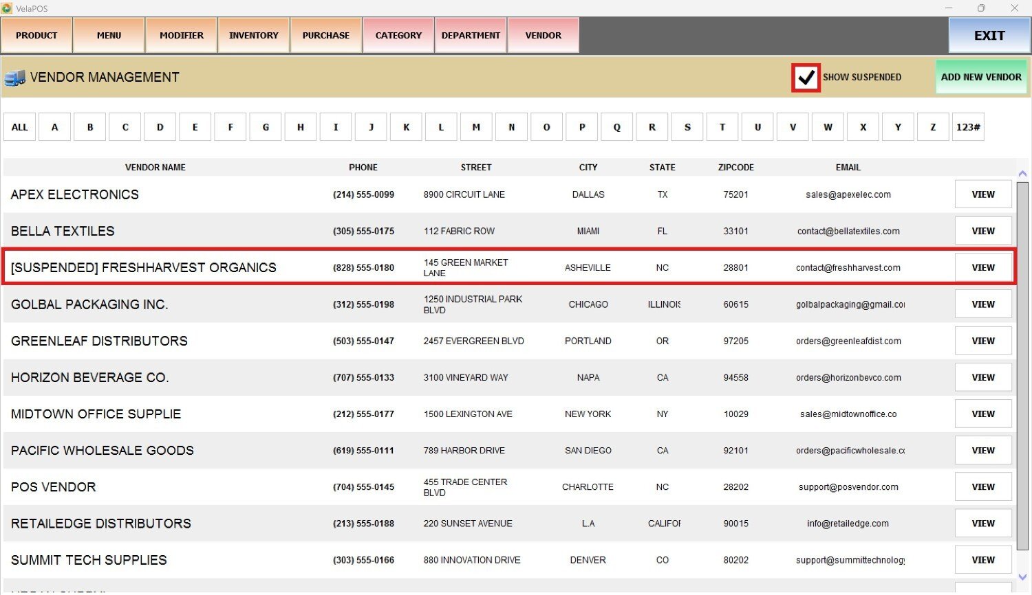 To reactivate the vendor, check the SHOW SUSPENDED box to display vendors marked as suspended.