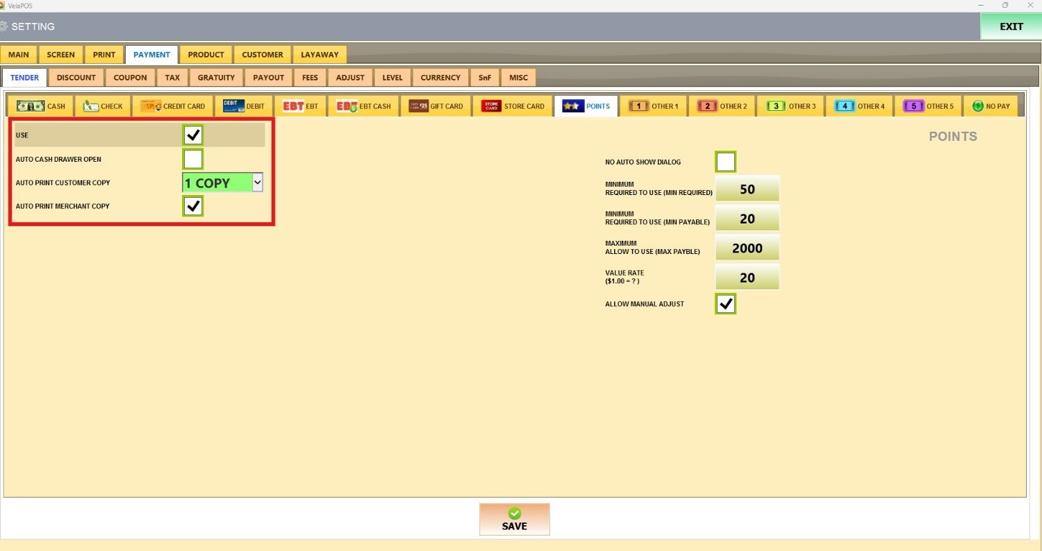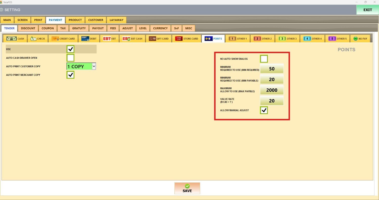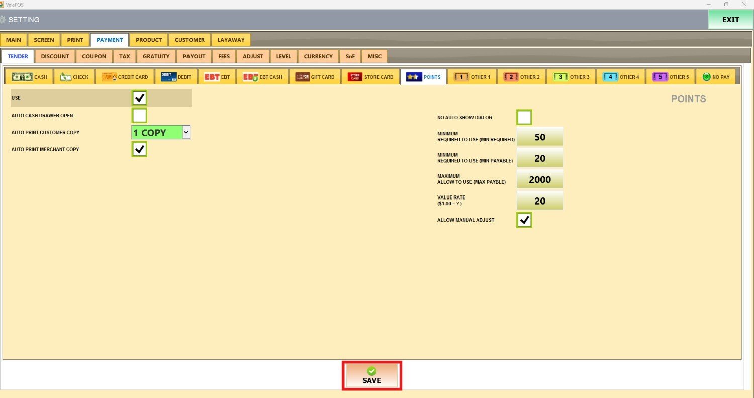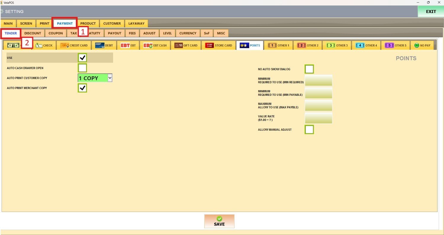 MENU> SETTINGS> PAYMENT> TENDER > POINTS