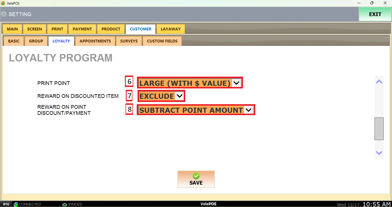 6. PRINT POINT: Choose how loyalty points will be displayed and printed on the customer receipt. Select the preferred print size.
