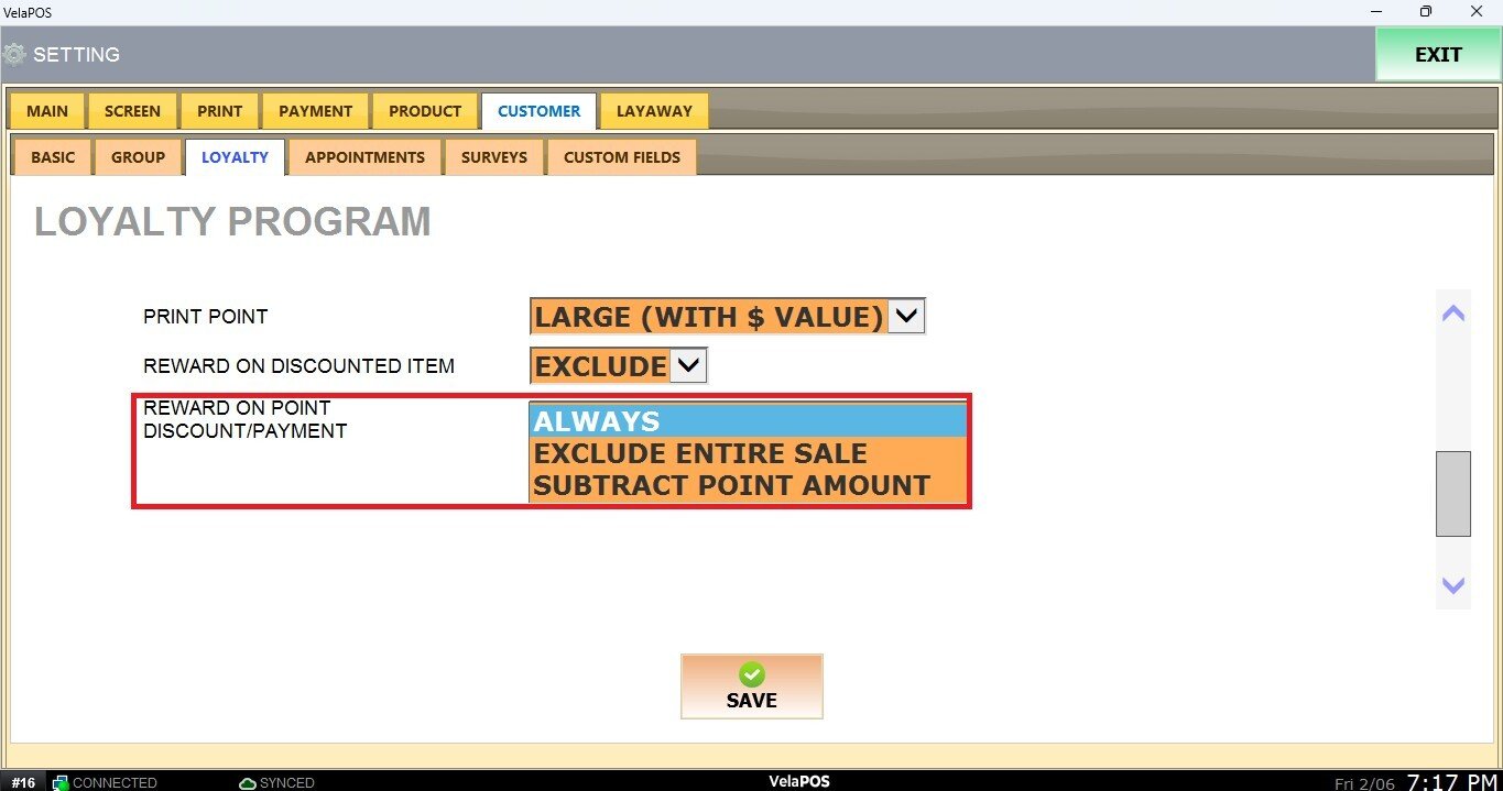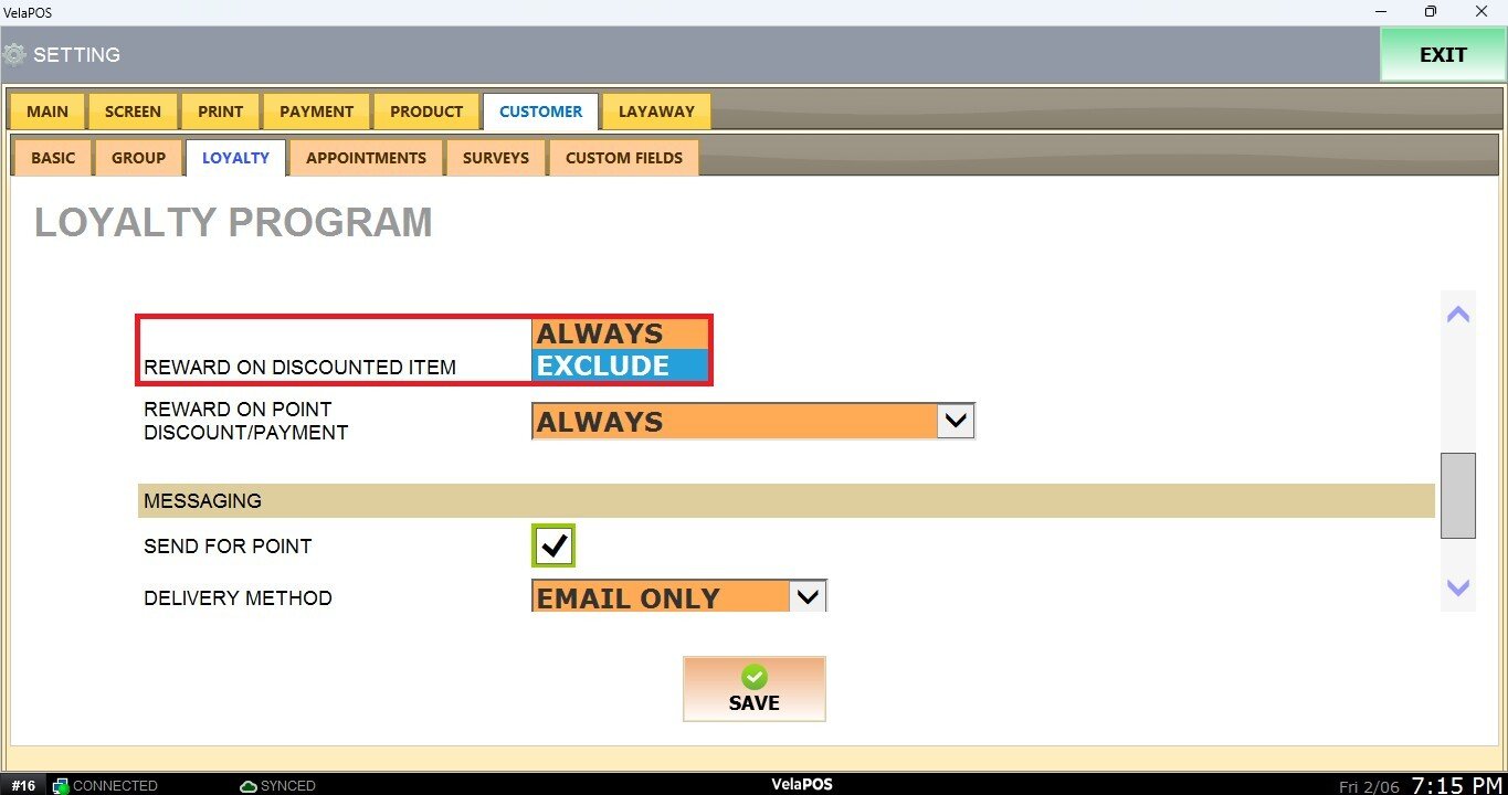 Main Screen> MENU> SETTINGS> CUSTOMER> LOYALTY