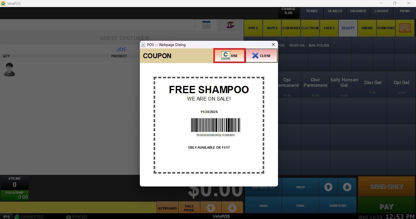 After ringing up the coupon, a screen displaying the coupon details will appear. Review the information carefully, then click USE to apply it.