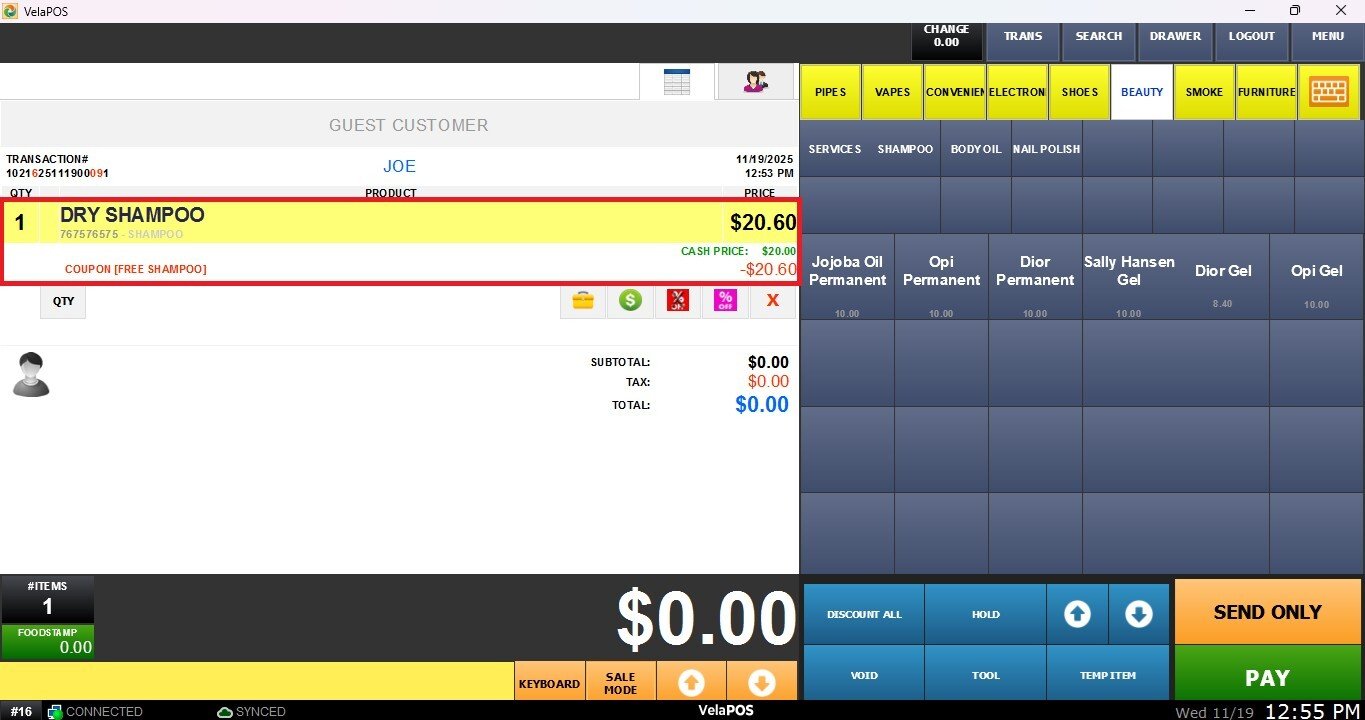 This feature allows you to link a coupon directly to a specific product. When the coupon is scanned or applied to the sale, the associated item is automatically added for free.