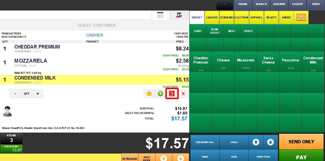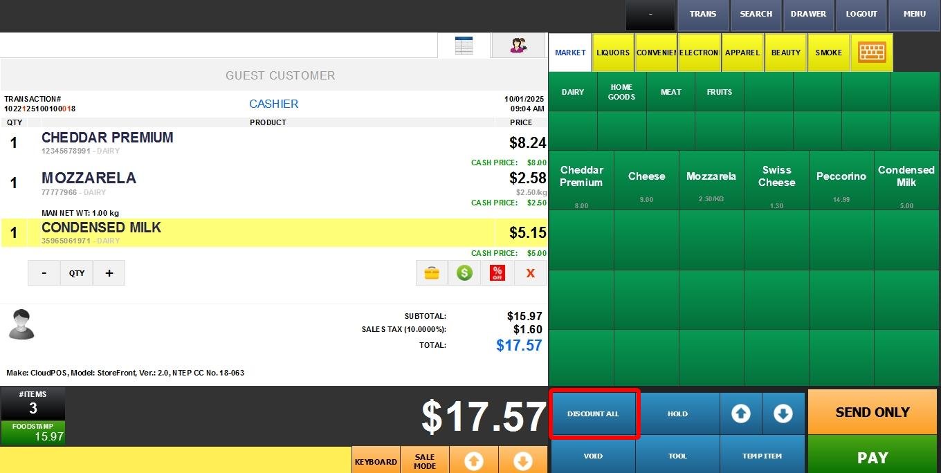 Sales Screen> DISCOUNT ALL button or % icon below the item