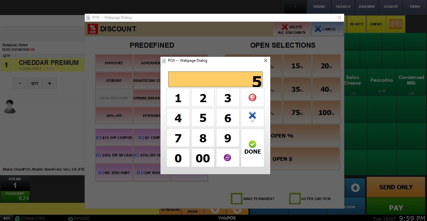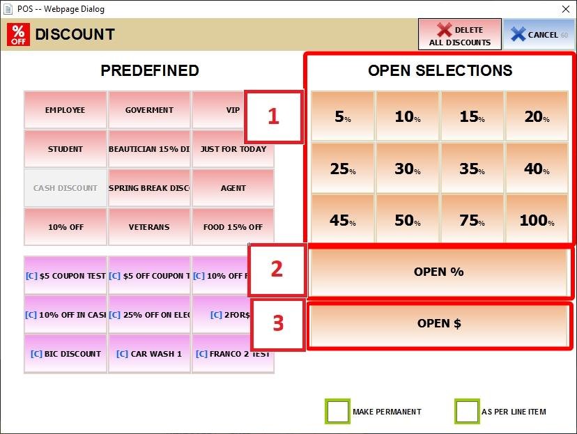 A window will appear containing common preset discounts and the custom options: OPEN % (for any percentage) and OPEN $ (for any dollar amount).