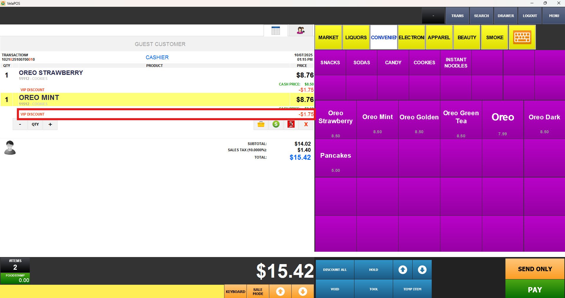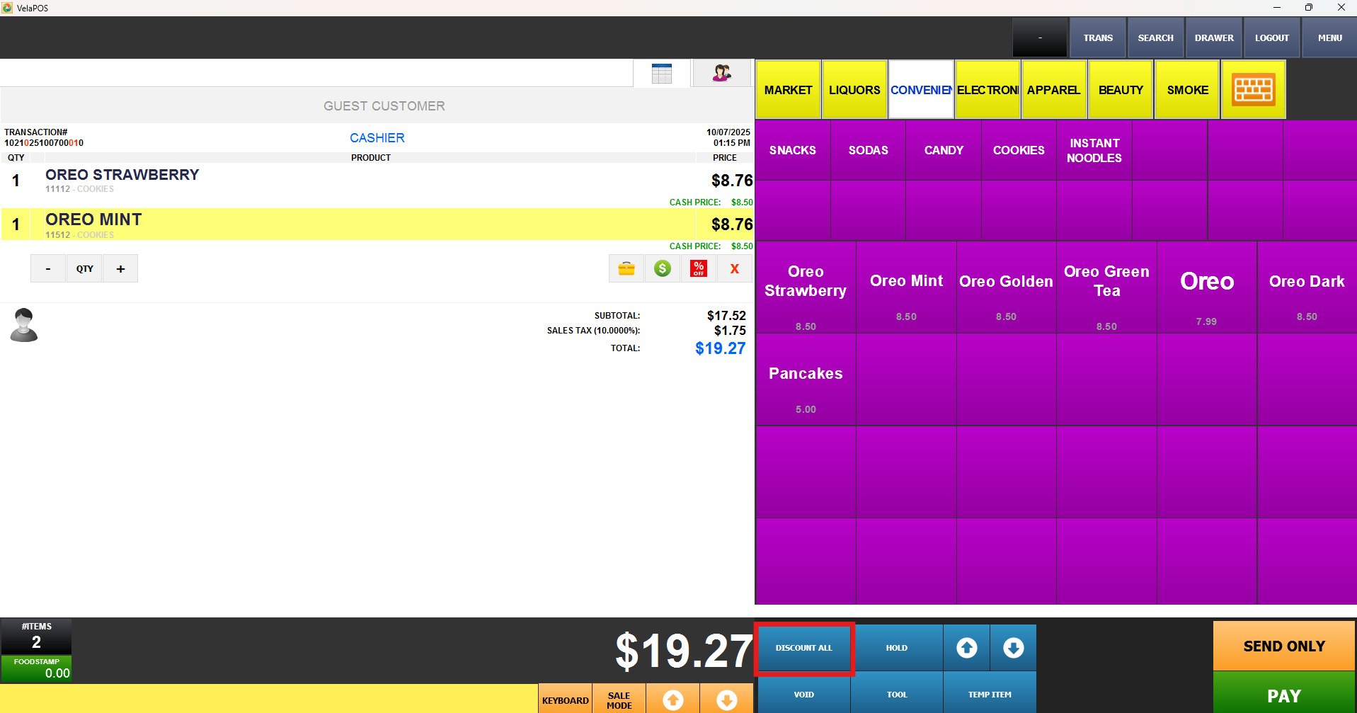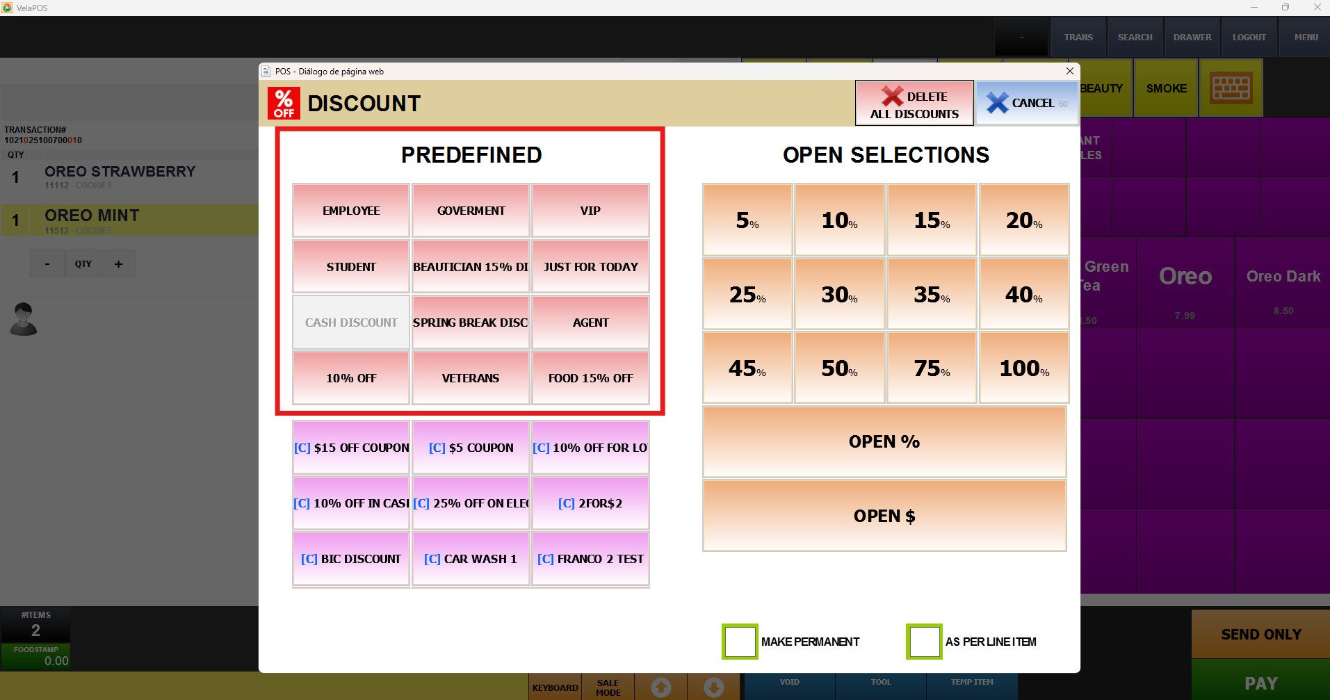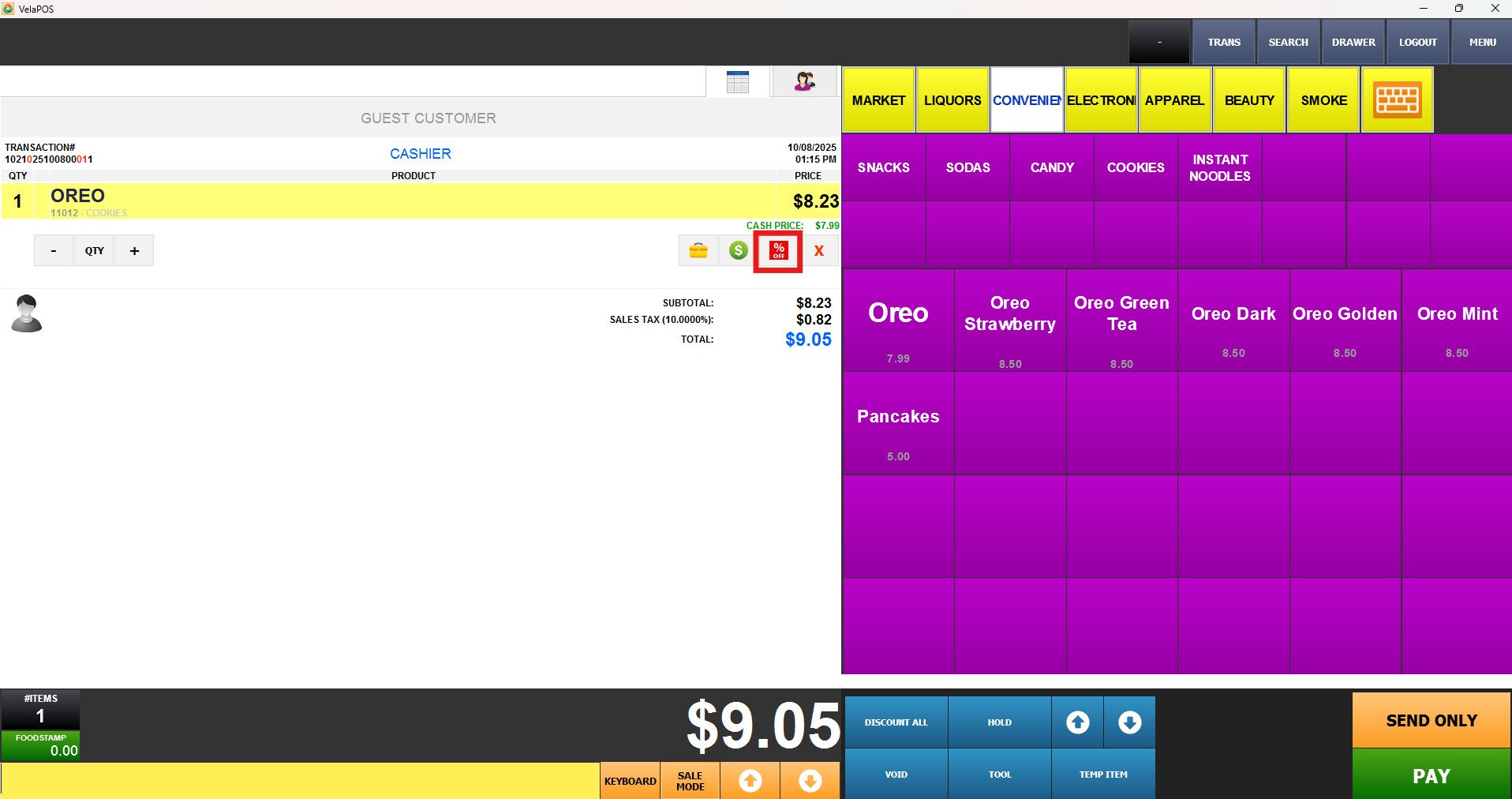 Main Screen> Number Pad> Sales Screen> Customer/Discount all or % icon below the item