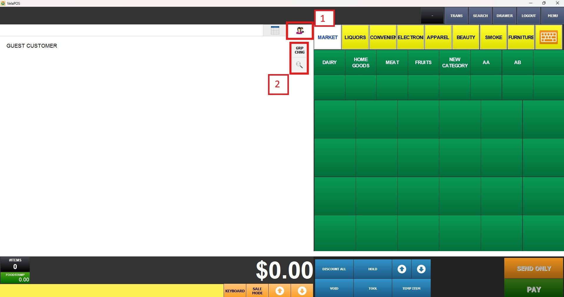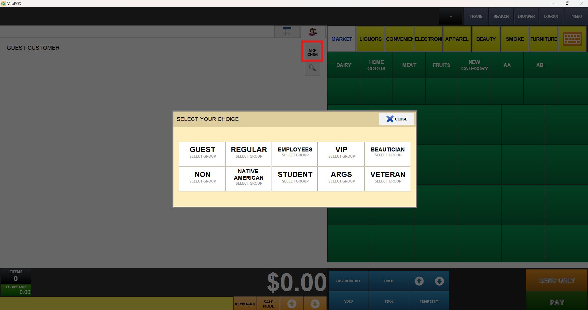 Press the customer icon and select between GRP CHNG or the magnifying glass icon