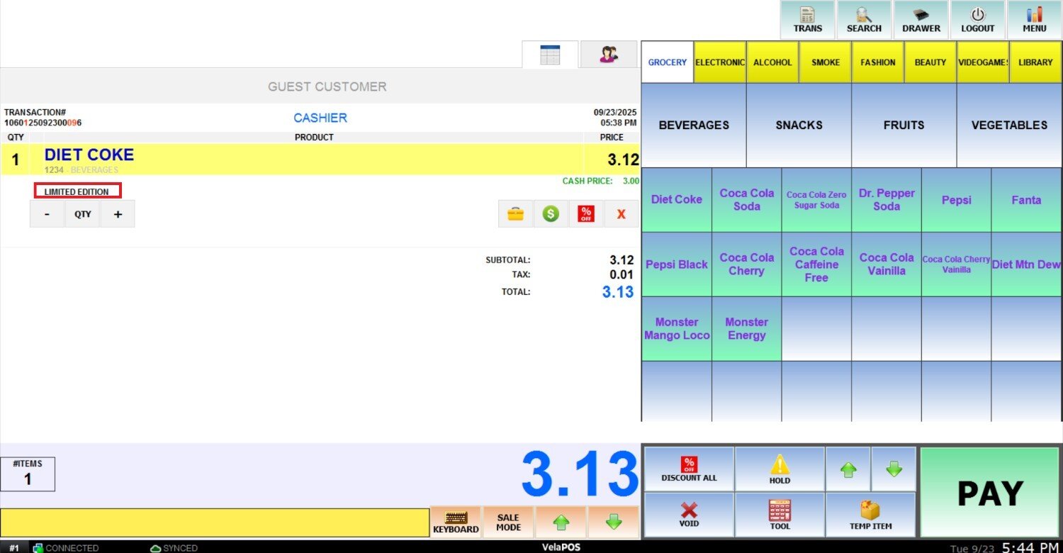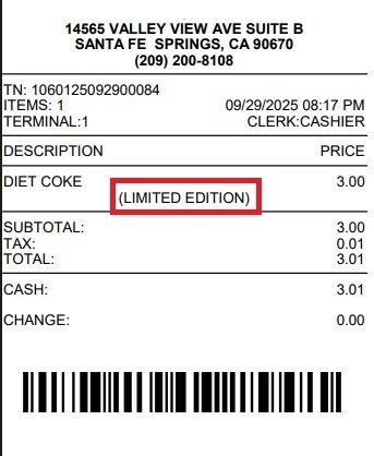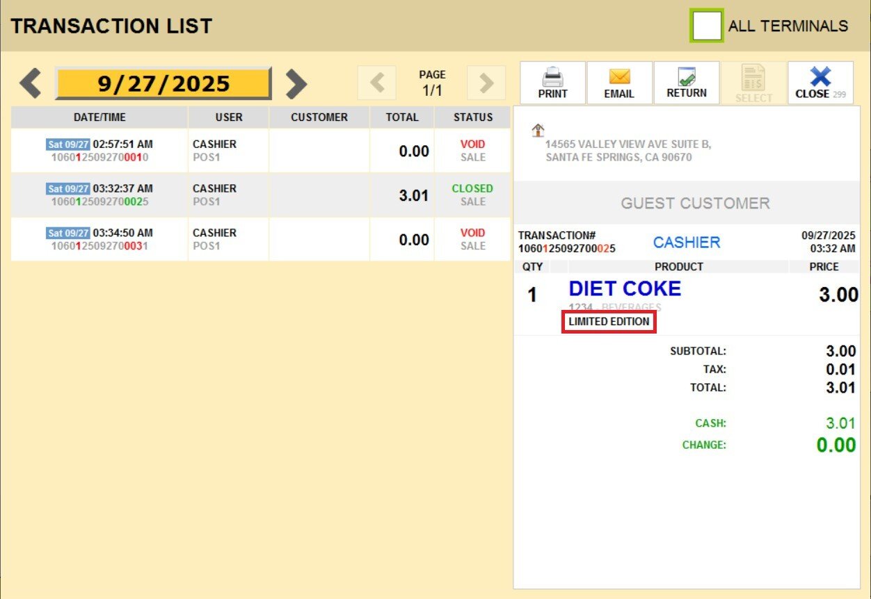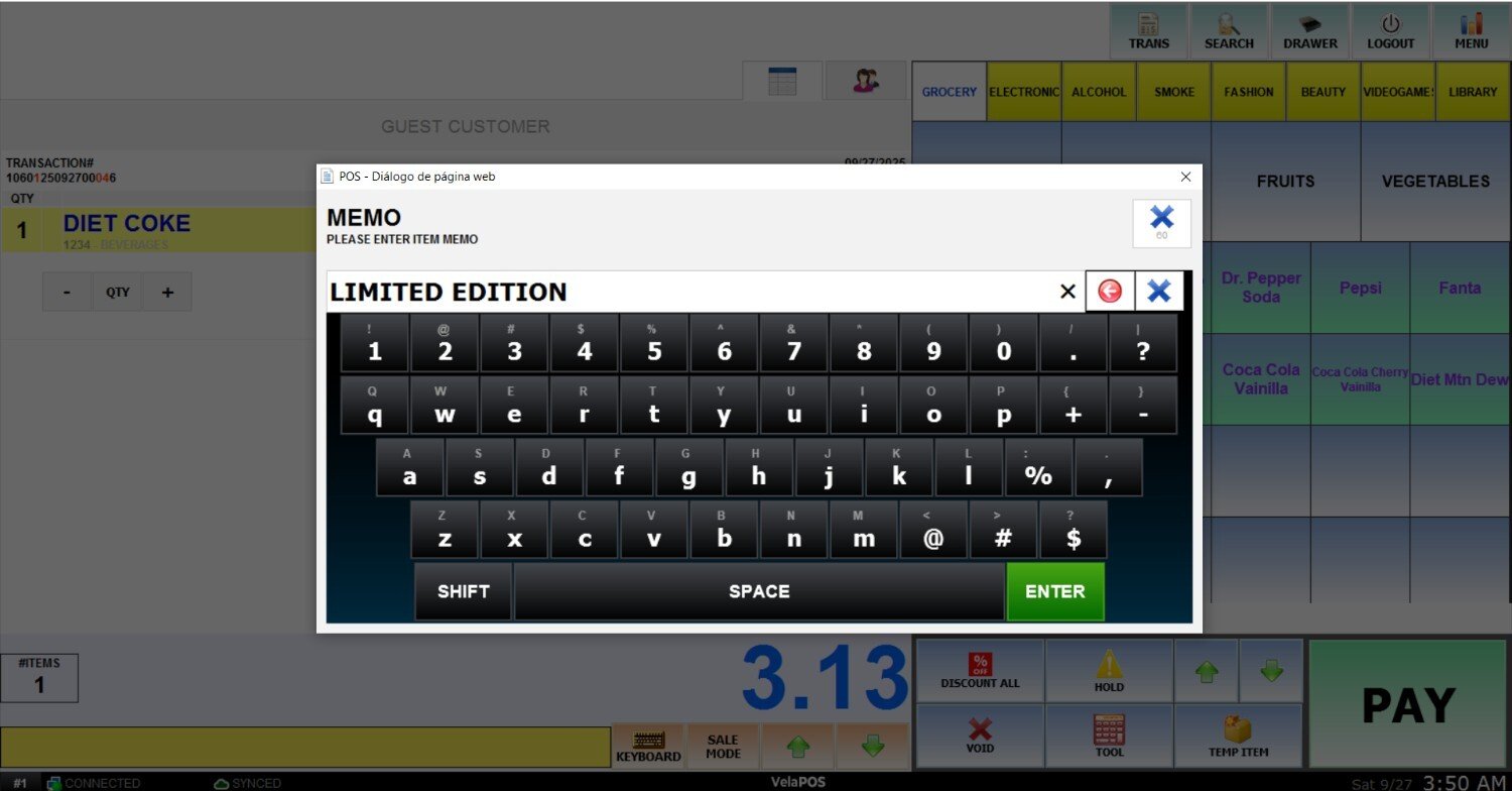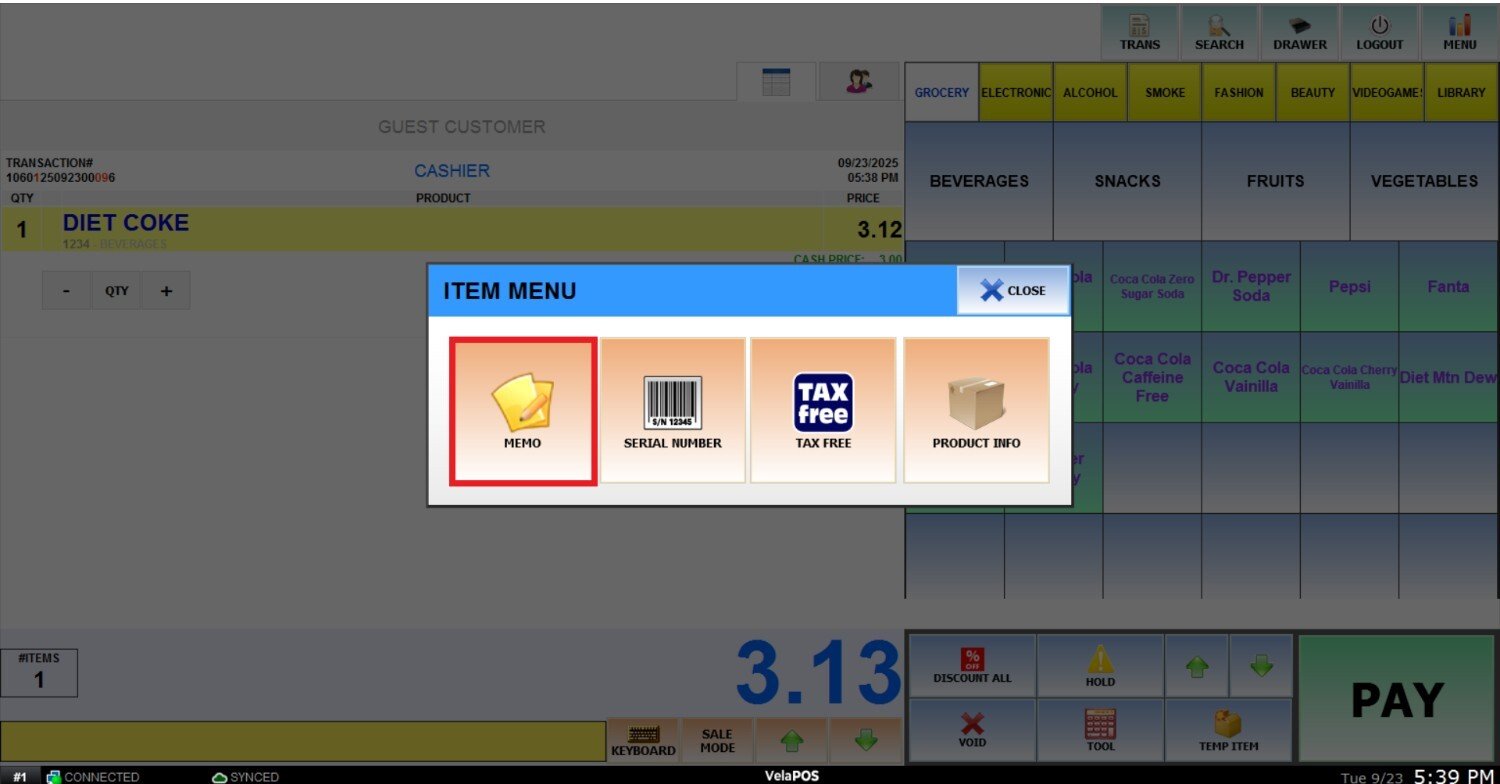 With this feature, you can add a customized note to an item. The note will appear below the selected item, on the transaction list, and on the printed receipt.