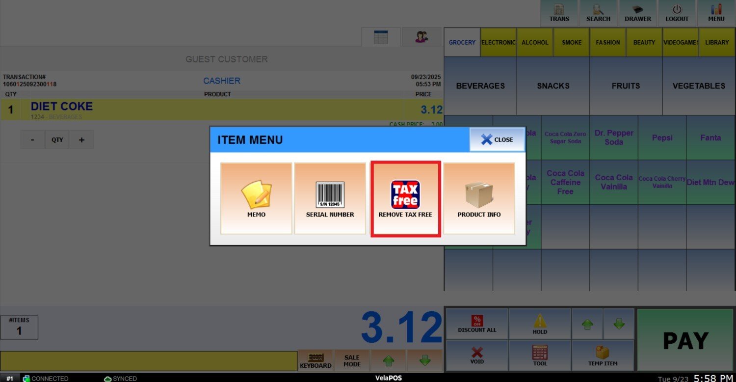 To restore taxes to the item, go back to the Item Menu and select REMOVE TAX FREE.